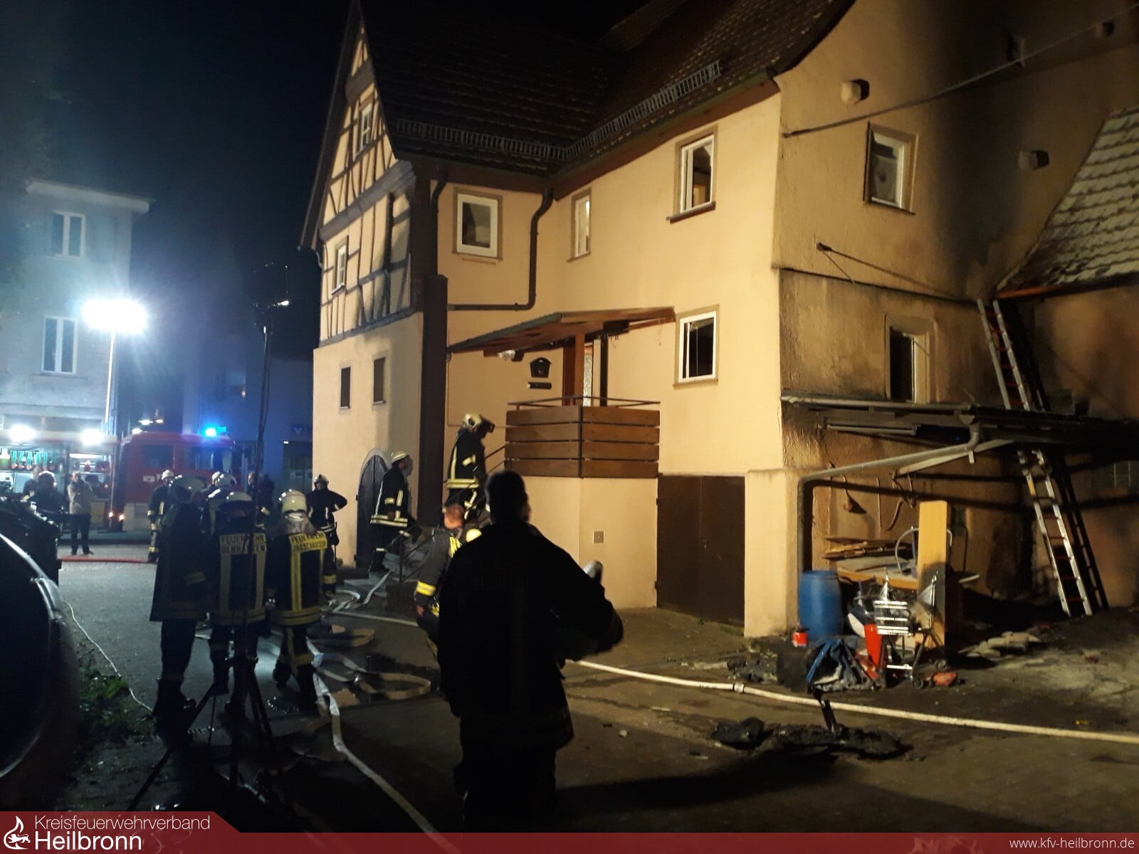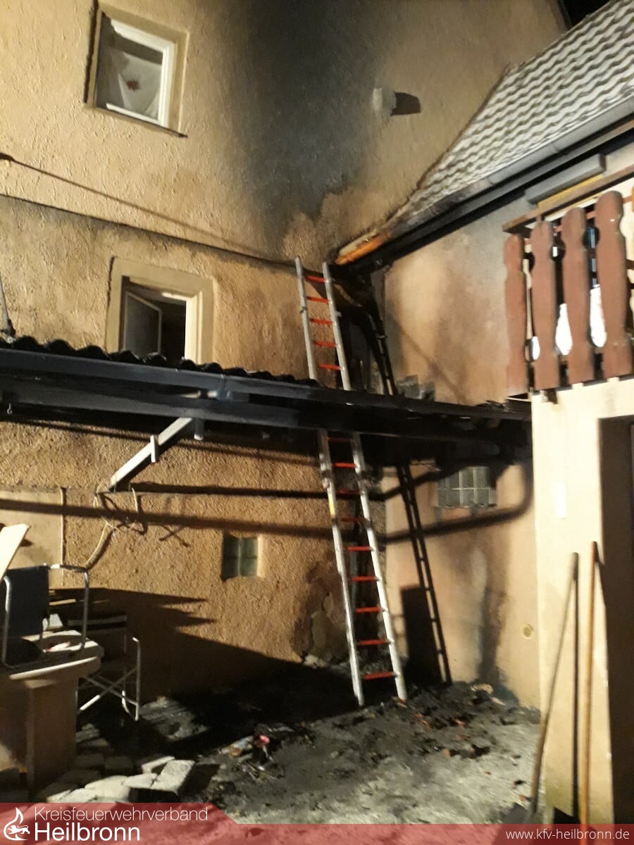 Zu einem Gebäudebrand wurde die FFW Jagsthausen/Olnhausen am 19.05. um 22:49 Uhr alarmiert. Gemeldet wurden brennende Mülltonnen innerhalb eines Gebäudes. Beim Eintreffen des ersten Fahrzeuges stellte sich die Lage so dar, dass alle Bewohner das teilweise stark verrauchte Gebäude bereits verlassen konnten. Zwei unter einem Vordach stehende Mülltonnen waren in Brand geraten, Fassade und Dächer wurden dadurch beschädigt. Ein Trupp unter Atemschutz begann mit der Brandbekämpfung an Vordach und Mülltonnen. Die Bewohner und Anwohner hatten zuvor bereits erste Löschversuche mit mehreren Feuerlöschern unternommen. Hierbei atmete ein Bewohner Brandrauch ein. Dieser wurde von der hinzu alarmierten Besatzung eines RTW vom Deutschen Roten Kreuz versorgt. Durch den Einsatz der Feuerlöscher war der Brand bereits größtenteils durch die Bewohner selbst gelöscht worden, einzelne Glutnester an Fassade und Dach mussten noch durch die Feuerwehr abgelöscht werden. Das Gebäude wurde zwischenzeitlich auf weitere Bewohner durchsucht und die Fenster wurden zur Belüftung der verrauchten Räume geöffnet. Per Wärmebildkamera der nachalarmierten Feuerwehr Widdern wurden Fassade und Dächer nochmals auf Glutnester kontrolliert. Die Bewohner konnten die Nacht bei Verwandten/Bekannten verbringen, eine Brandwache wurde bis zum nächsten Morgen um 08:00 Uhr eingerichtet.