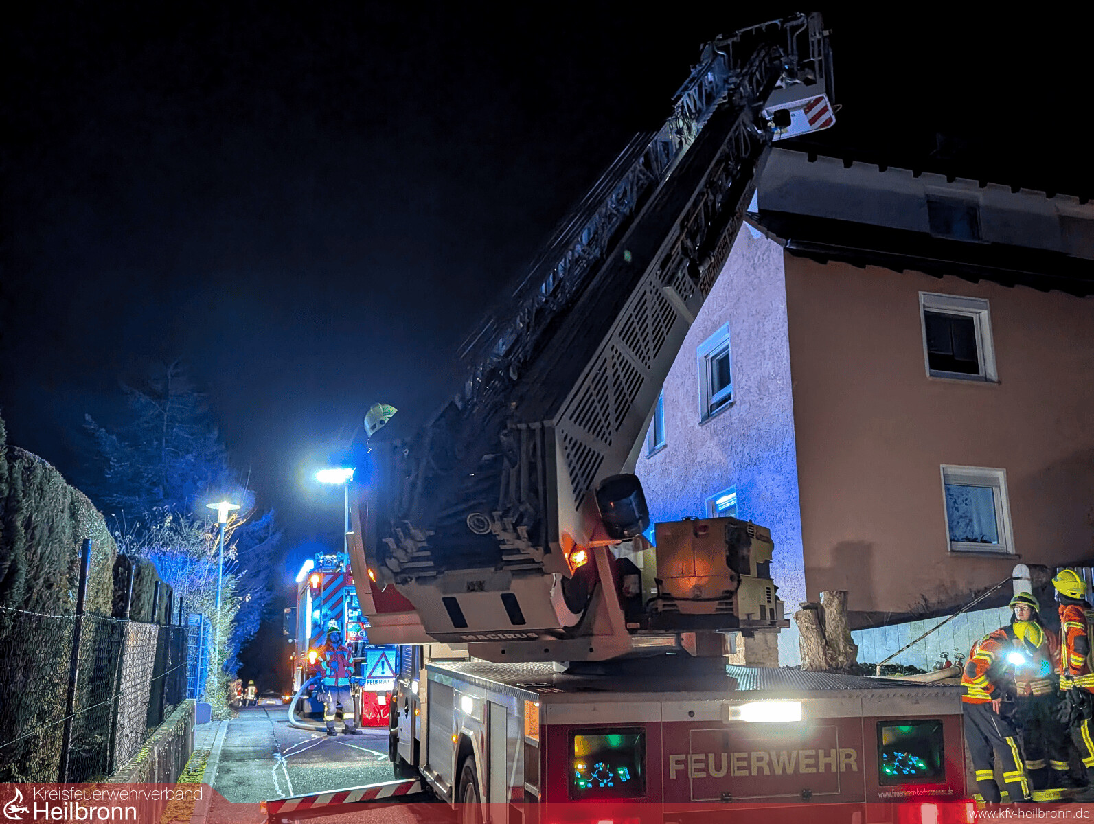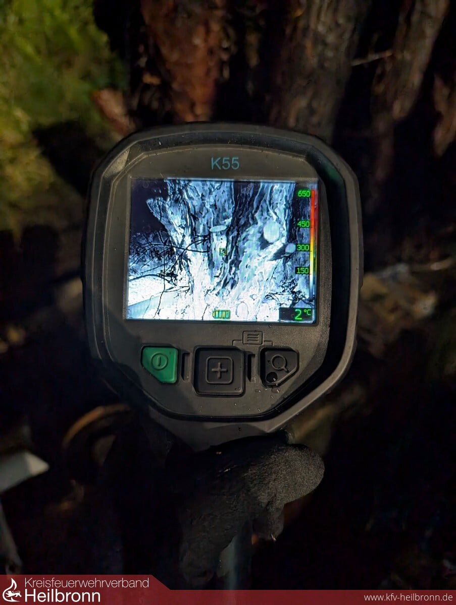Mithilfe der Drehleiter und einer Wärmebildkamera wurden der obere Bereich der Tanne sowie das Dach des Wohngebäudes kontrolliert und Glutnester gezielt abgelöscht.