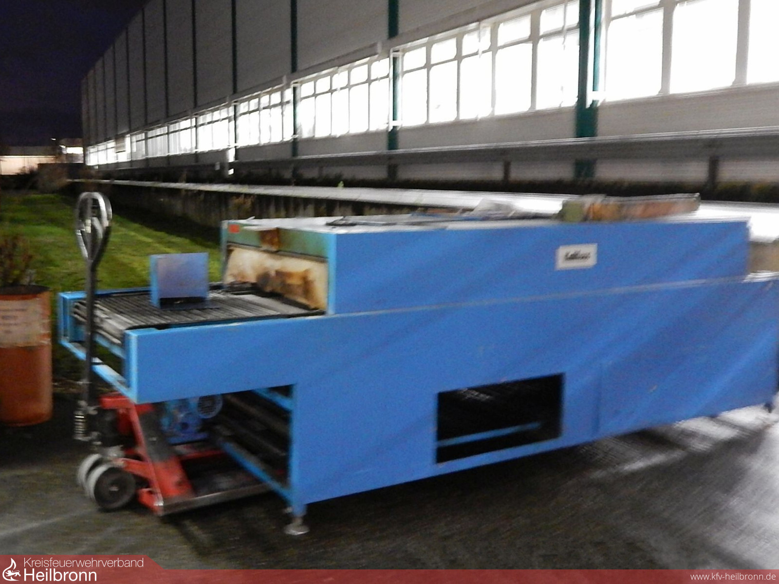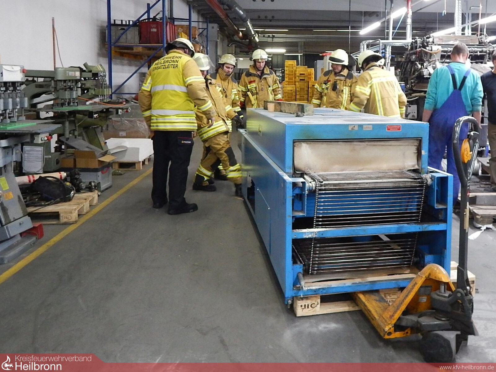 Aus der Maschine drang dennoch dichter Rauch aus. Aufgrund der kompakten Bauweise war es schwierig eine gezielte Brandbekämpfung durchzuführen. Zur Vermeidung einer weiteren Verrauchung der Fabrikationshalle sowie Schäden durch Löschmittel wurde die komplette Maschine kurzerhand ins Freie geschafft.