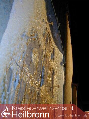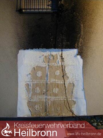 Da an der verrussten Hauswand eine starke Wärementwicklung ausgemacht werden konnte, wurde diese auf einer Fläche von ca. 4 qm geöffnet. Aufgrund der Hitzeentwicklung am brennendem Motorrroller war die unrer der Fassade liegende Styroporwärmedämmung geschmolzen.