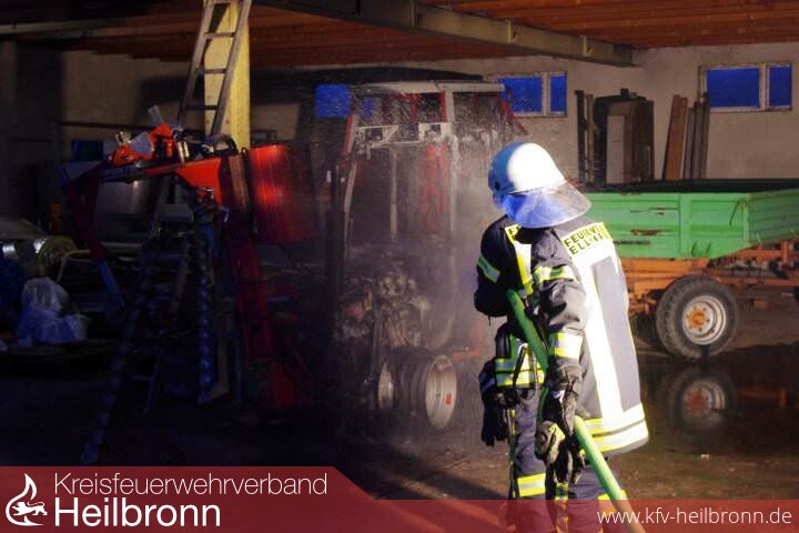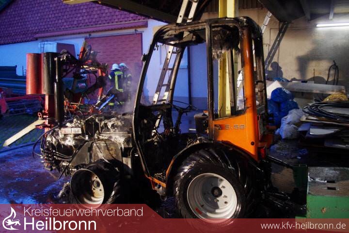 Die Eigentümerin des Anwesens war durch einen lauten Knall aufgewacht und fand in einer Scheune/Unterstand einen brennenden Schmalspurschlepper vor.Sie verständigte um 04.48 Uhr die Feuerwehr.