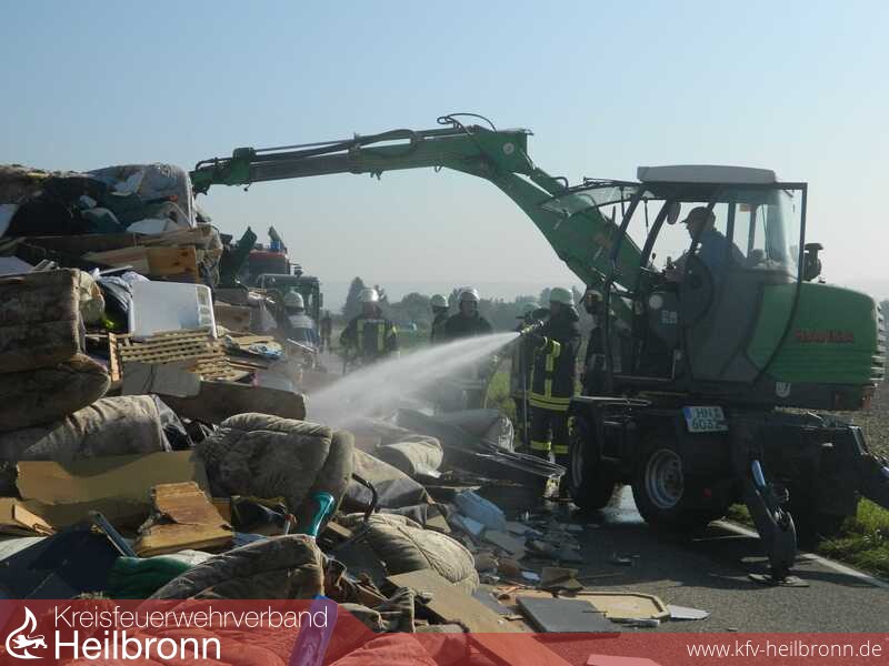 Nach Sicherstellung des Brandschutzes wurde der Inhalt auf die Straße abgekippt und der sofort aufflammende Sperrmüll abgelöscht.