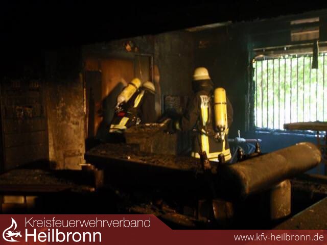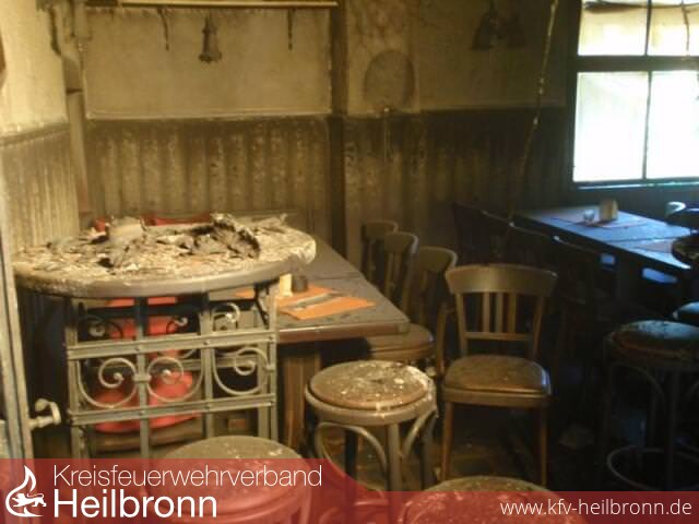 Aus dem teils ein- und zweigeschossigen Gebäude mit einer Grundfläche von 7 x 22 Meter kam aus allen Öffnungen starker Rauch. An der Gebäuderückseite schlugen die Flammen aus dem Fenster und entzündeten die hölzerne Außenfassade. Mit Atemschutzgeräten gingen die Einsatzkräfte aus Böckingen, Heilbronn und der Berufsfeuerwehr in das Gebäude vor, durchsuchten die Räume nach Personen und löschten das Feuer. Ein unmittelbar an der Wirtschaft stehender Flüssiggastank konnte abgestellt werden.
