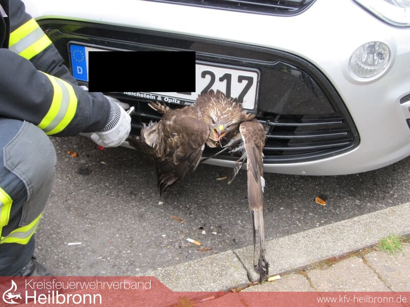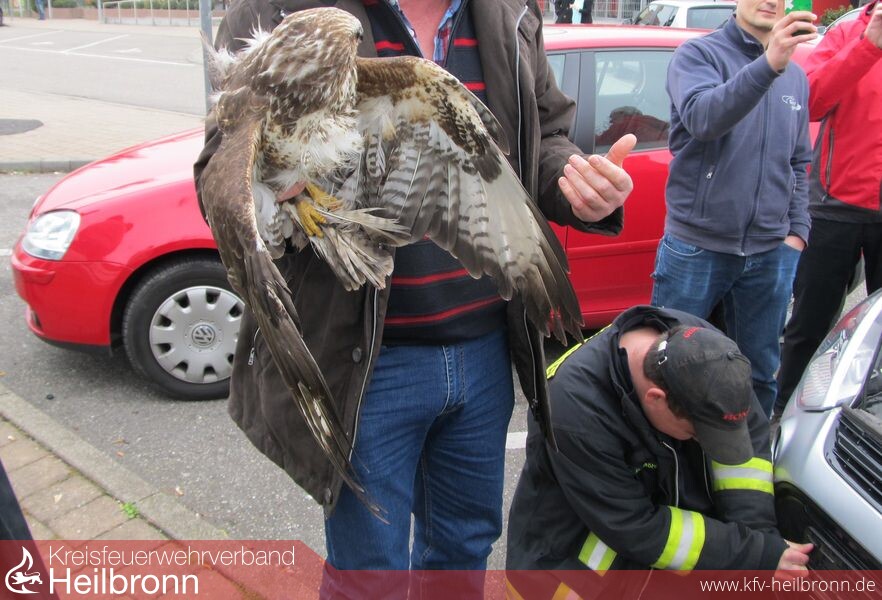 Die Feuerwehr Ilsfeld wurde mit dem Alarmstichwort Tiernotlage/Kadaver auf die Tank-Rastanlage Wunnenstein alarmiert. Ein Bussard flog auf der Autobahn in den Kühlergrill eines Fords. Als der Fahrer des Autos in die Rastanlage Wunnenstein einfuhr bemerkte er, dass der Greifvogel noch im Kühlergrill feststeckt und lebt.