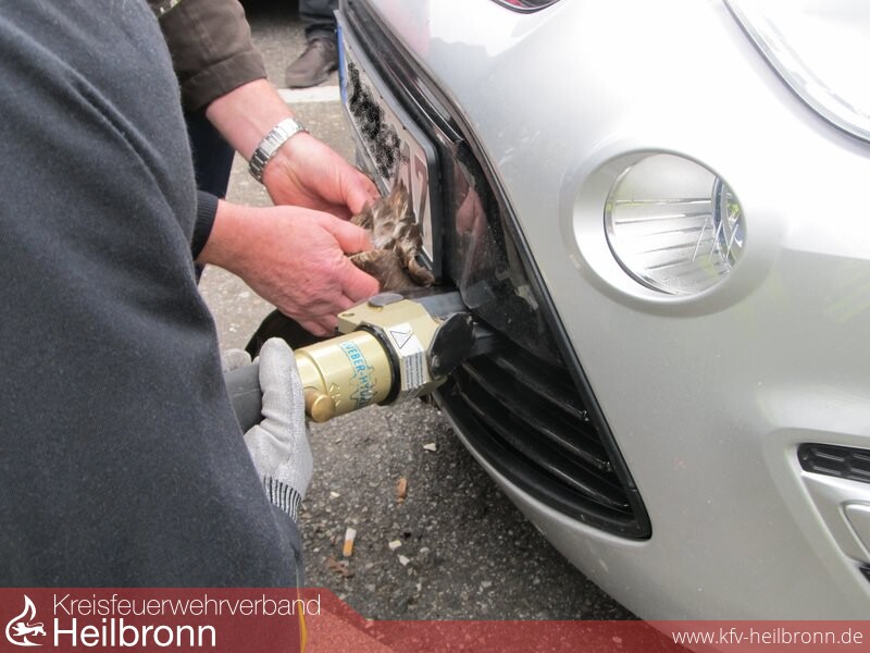Ein von der Autobahnpolizei verständigter Experte von der Greifvogelstation Bad Friedrichshall konnte den Vogel jedoch auch nicht aus seiner misslichen Lage befreien. Deshalb wurde die Feuerwehr alarmiert. Der Bussard war derart im Kühlergrill verkeilt dass man ihn mit dem hydraulischen Pedalschneider herausschneiden musste.