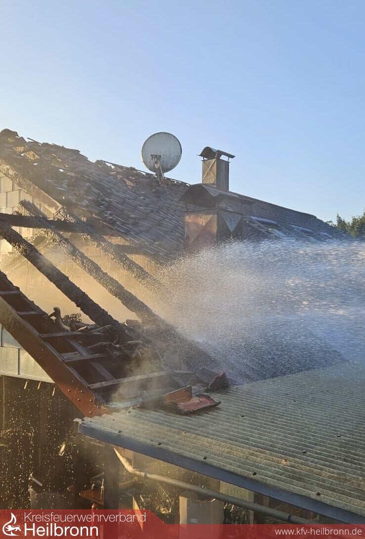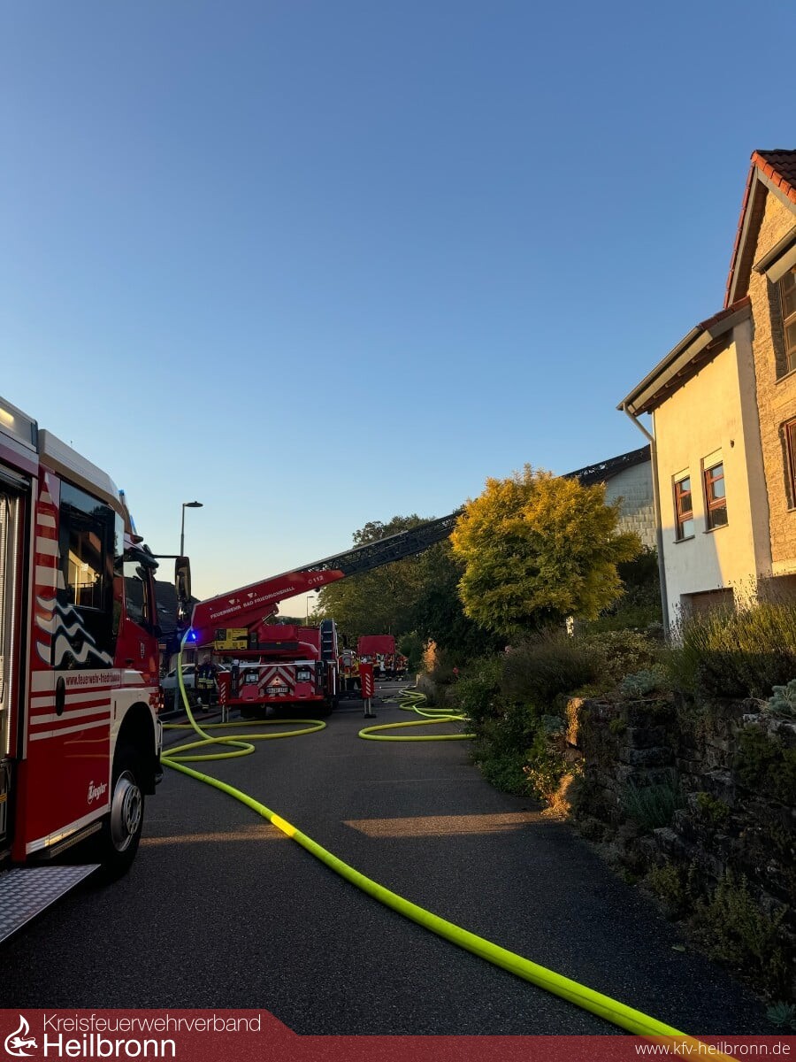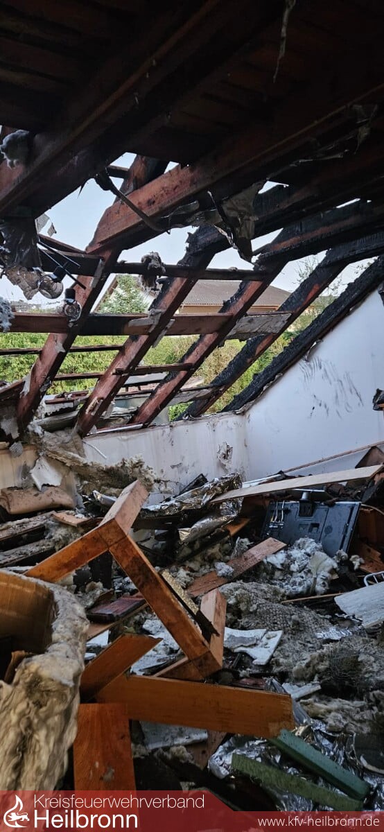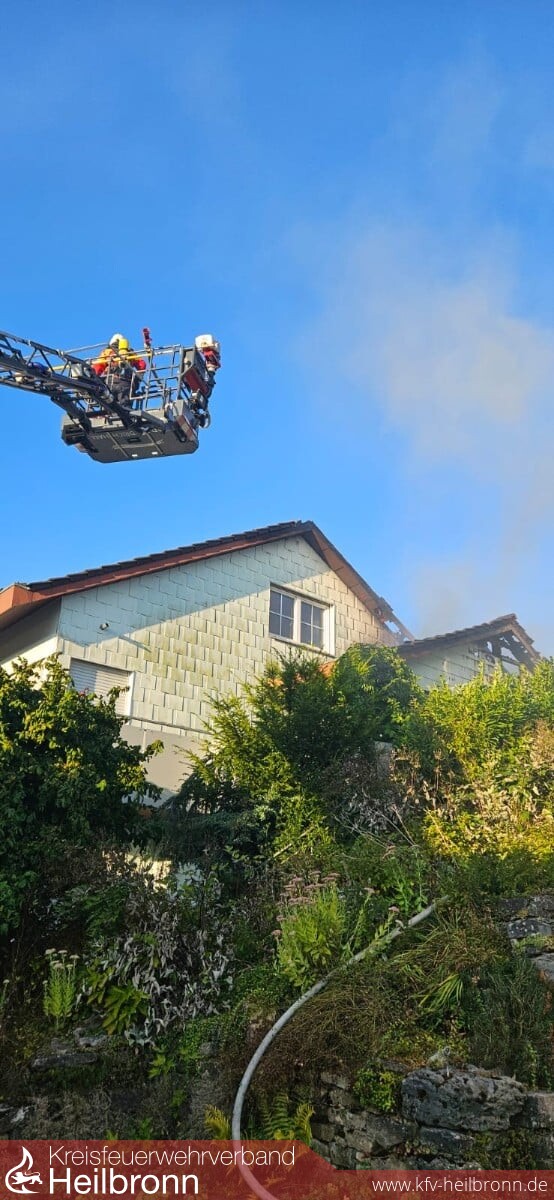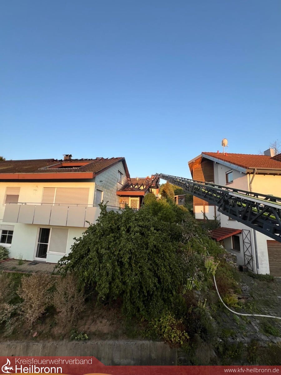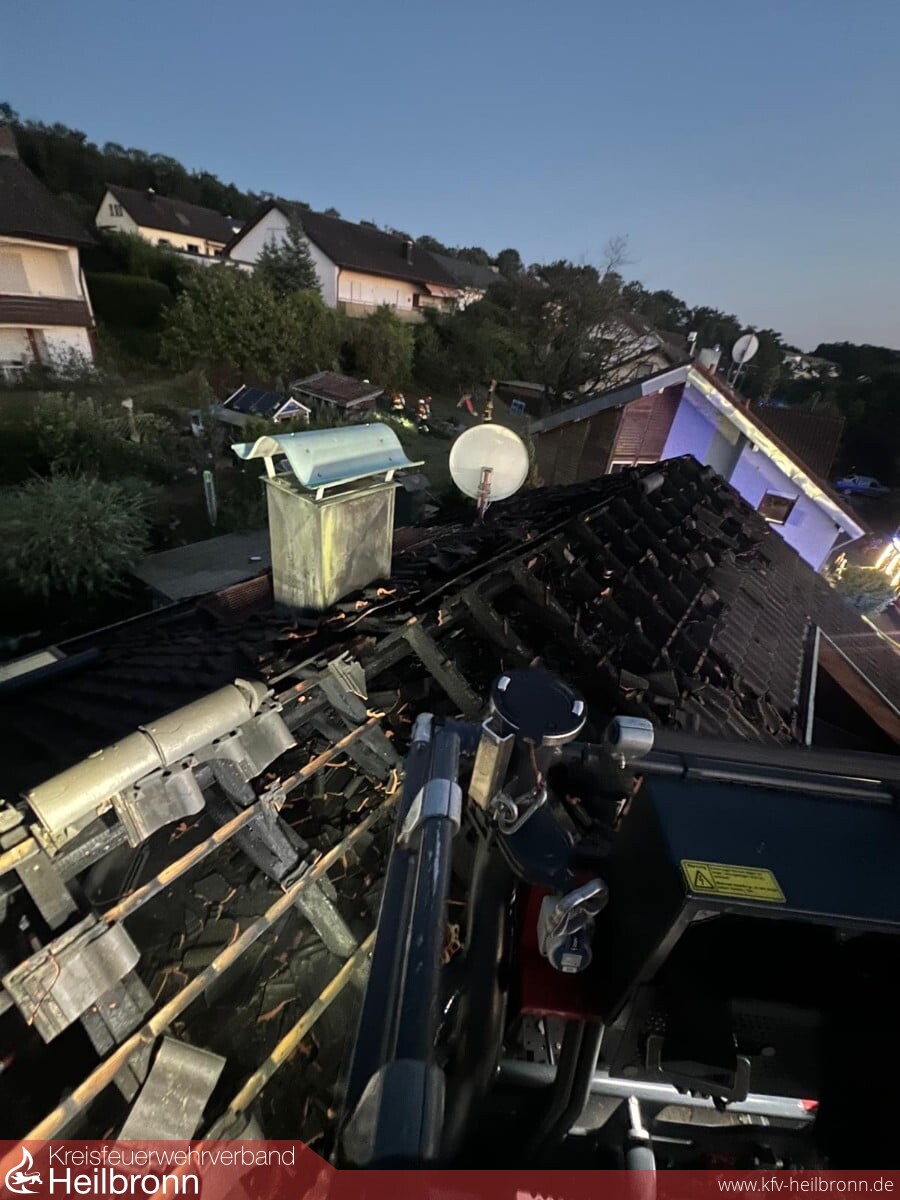 Beim Eintreffen brannte Im Terrassenbereich eine Überdachung und ein Hausanbau, der Brand war auch bereits auf das Gebäude und den Dachstuhl übergegriffen. Durch die Bebauung und Hanglage war der Zugang sehr beengt. Die ersten Trupps gingen in den Dachbereich und den Terrassenbereich vor. Über die DLK kam ein weiteres Rohr im Dachbereich in Einsatz. Weitere Trupps kamen von der darüber- bzw. dahinterliegenden Wohnbebauung auf die Gebäuderückseite in Einsatz. Nachalarmierte Kräfte stellten eine weitere Löschwasserversorgung her und hielten Atemschutztrupps und Geräte in Bereitstellung. Messtrupps waren im Ort unterwegs und führten Schadstoffmessungen durch. Über die Warn App NINA wurde die Bevölkerung aufgerufen Türen und Fenster geschlossen zu halten sowie die Einsatzstelle zu meiden. Die Bewohner des Mehrfamilienhauses hatten unverzüglich das Gebäude verlassen. Ein Bewohner wurde durch den Rettungsdienst in eine Klinik überführt. Der Dachbereich musste großflächig geöffnet werden da sich der Brand im Zwischensparrenbereich, in der Dämmung und im Spitzboden ausbreitete und Glutnester bildete. Die Wohnungen im Erdgeschoss und Obergeschoss blieben weitgehend unbeschädigt. Die Bewohner wurden aber gebeten die Nacht bei Bekannten zu verbringen. Vor Ort war auch der Bürgermeister, das Ordnungsamt, Polizei, Rettungsdienst, DRK-Ortsverein, Regionalwerke, Nachbarfeuerwehren Gundelsheim, Neckarsulm und die Berufsfeuerwehr HN.