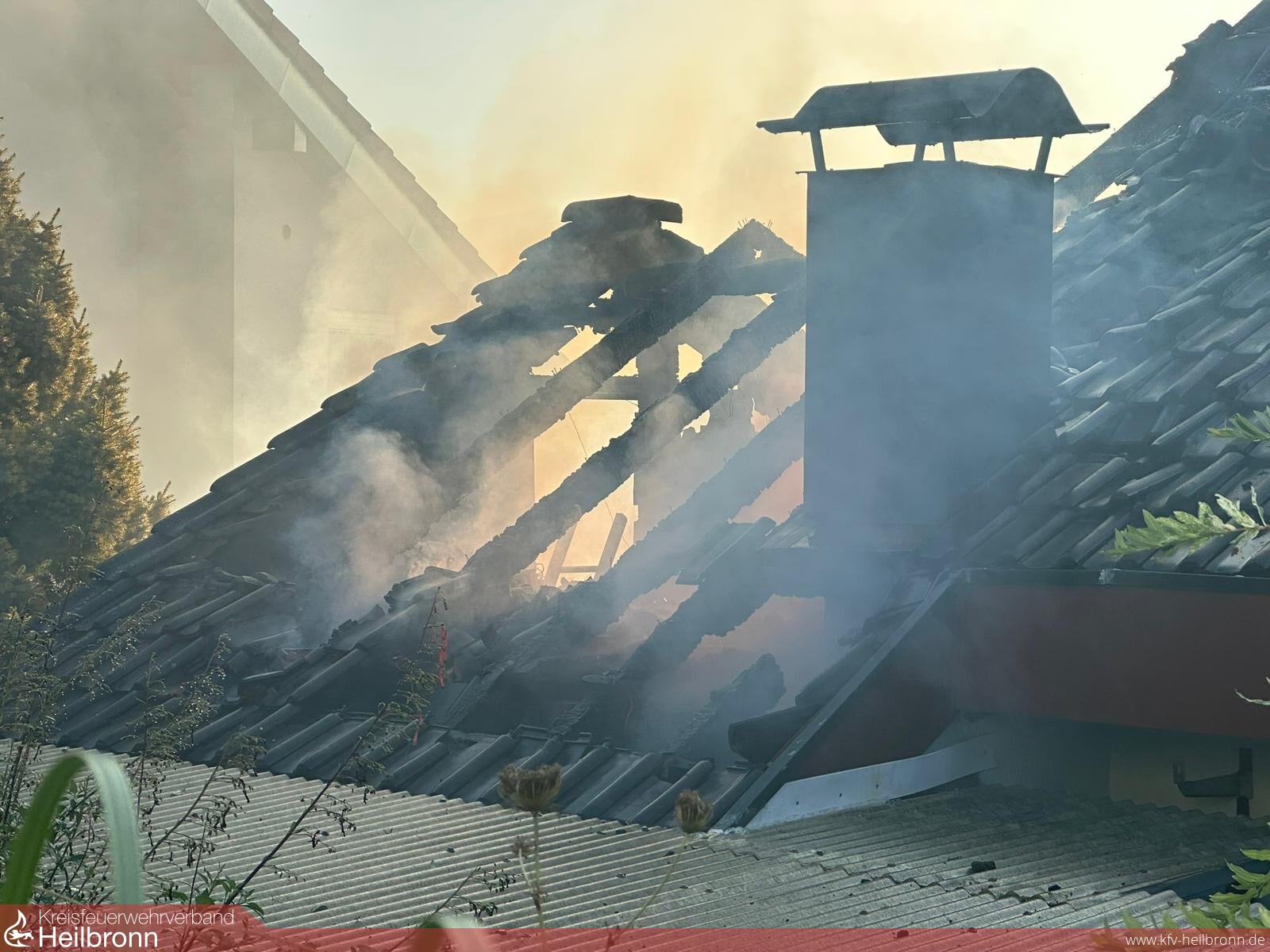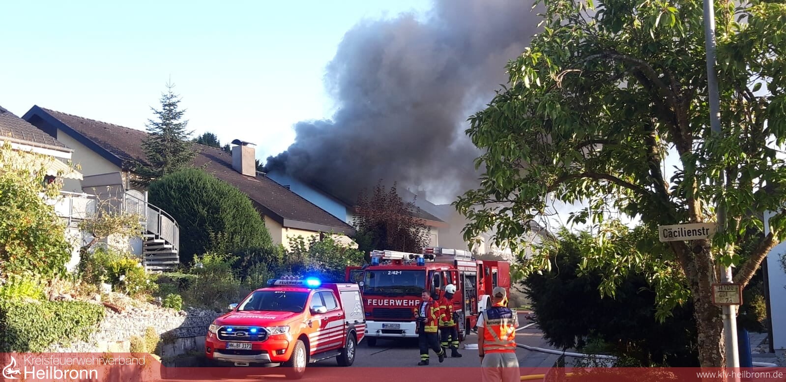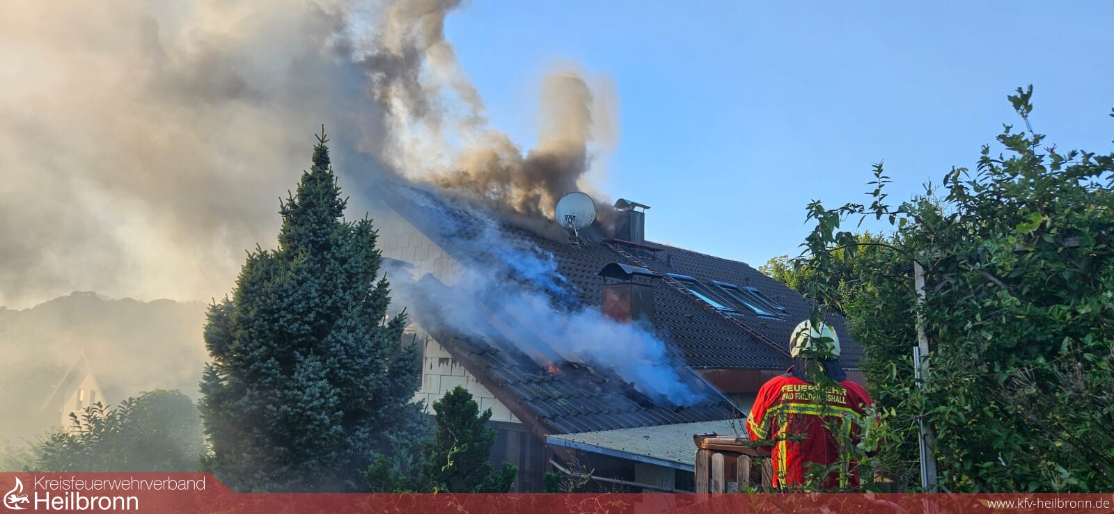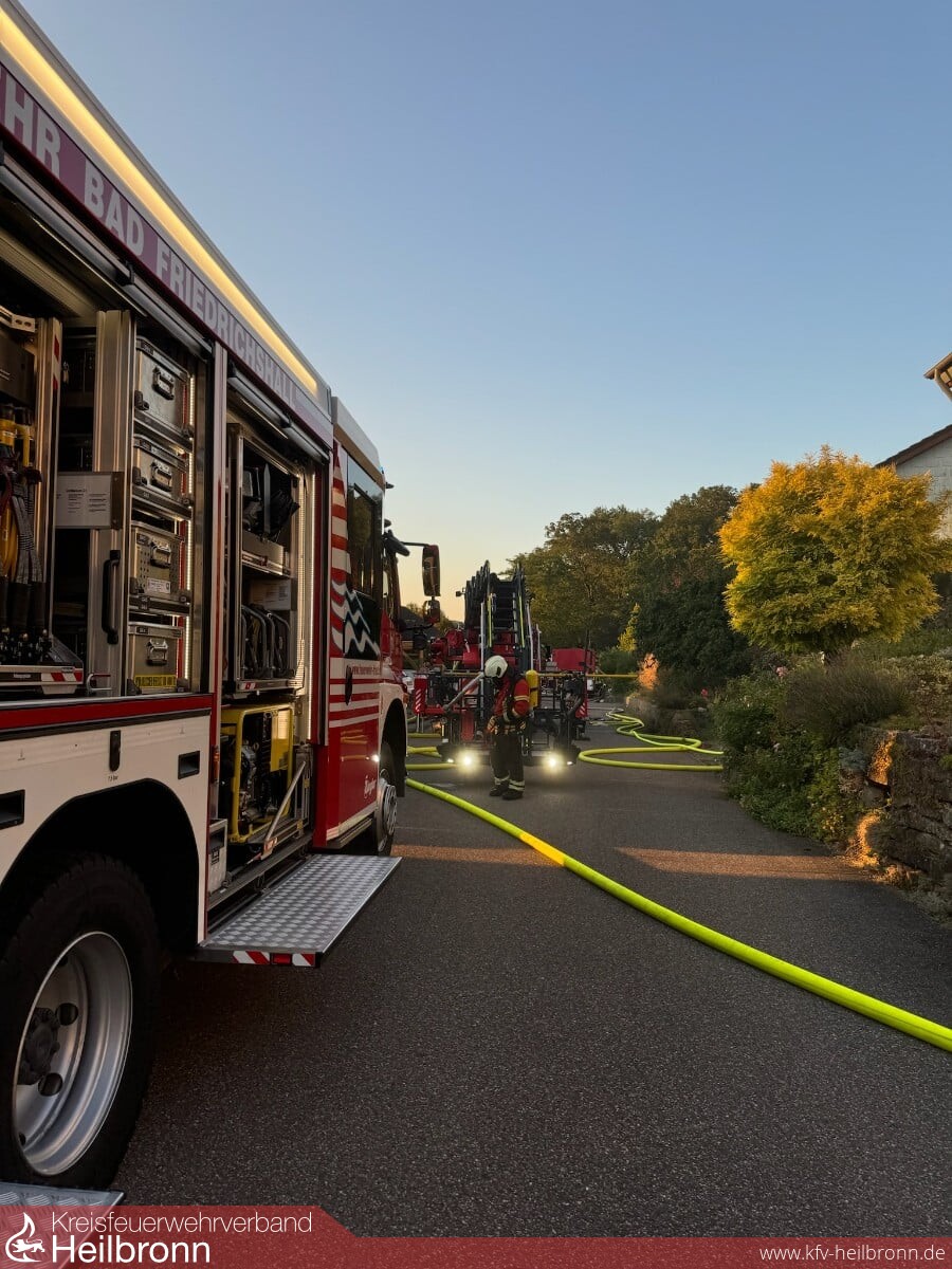 Beim Eintreffen brannte Im Terrassenbereich eine Überdachung und ein Hausanbau, der Brand war auch bereits auf das Gebäude und den Dachstuhl übergegriffen. Durch die Bebauung und Hanglage war der Zugang sehr beengt. Die ersten Trupps gingen in den Dachbereich und den Terrassenbereich vor. Über die DLK kam ein weiteres Rohr im Dachbereich in Einsatz. Weitere Trupps kamen von der darüber- bzw. dahinterliegenden Wohnbebauung auf die Gebäuderückseite in Einsatz. Nachalarmierte Kräfte stellten eine weitere Löschwasserversorgung her und hielten Atemschutztrupps und Geräte in Bereitstellung. Messtrupps waren im Ort unterwegs und führten Schadstoffmessungen durch. Über die Warn App NINA wurde die Bevölkerung aufgerufen Türen und Fenster geschlossen zu halten sowie die Einsatzstelle zu meiden. Die Bewohner des Mehrfamilienhauses hatten unverzüglich das Gebäude verlassen. Ein Bewohner wurde durch den Rettungsdienst in eine Klinik überführt. Der Dachbereich musste großflächig geöffnet werden da sich der Brand im Zwischensparrenbereich, in der Dämmung und im Spitzboden ausbreitete und Glutnester bildete. Die Wohnungen im Erdgeschoss und Obergeschoss blieben weitgehend unbeschädigt. Die Bewohner wurden aber gebeten die Nacht bei Bekannten zu verbringen. Vor Ort war auch der Bürgermeister, das Ordnungsamt, Polizei, Rettungsdienst, DRK-Ortsverein, Regionalwerke, Nachbarfeuerwehren Gundelsheim, Neckarsulm und die Berufsfeuerwehr HN.