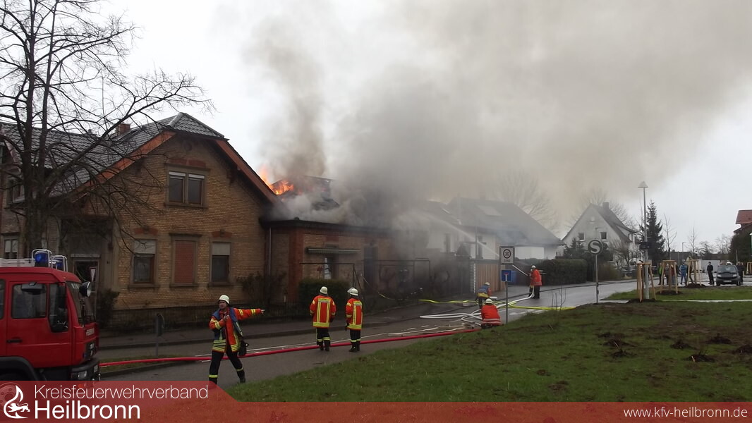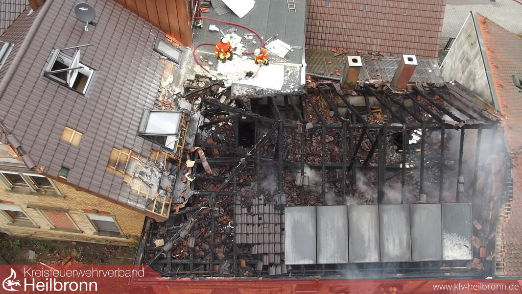 Die Feuerwehr Bad Rappenau wurde zu einem Dachstockbrand im Ortsteil Babstadt gerufen. Beim Eintreffen der ersten Kräfte, brannte der Dachstuhl eines Anbaus bereits in voller Ausdehnung. Im Gebäude selbst befanden sich keine Personen mehr. Da angrenzend ein Mehr- und ein Einfamilienhaus durch Brandausbreitung gefährdet waren, wurde zunächst eine Riegelstellung über Drehleiter und ein B-Rohr vorgenommen. Weiterhin wurden Trupps im Innenangriff eingesetzt. Wegen des hohen Bedarfes an Atemschutzgeräteträgern wurden weitere Abteilungen zur Unterstützung alarmiert. Durch die verwinkelte Dachkonstruktion mussten für die Nachlöscharbeiten mehrere Wände und Decken geöffnet werden, um zuverlässig alle Glutnester zu löschen. Beschädigte Dächer wurden durch die Feuerwehr und ein Zimmereibetrieb mit Planen gesichert. Neben der Feuerwehr Bad Rappenau war der DRK-Ortsverband und Rettungsdienst mit 13 Einsatzkräften im Einsatz. Das Polizeirevier Eppingen war mit 2 Polizeibeamten vor Ort. Weiterhin war die Feuerwehr Heilbronn mit dem Abrollbehälter-Atem-/Strahlenschutz mit 2 Einsatzkräften vor Ort.