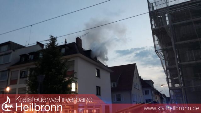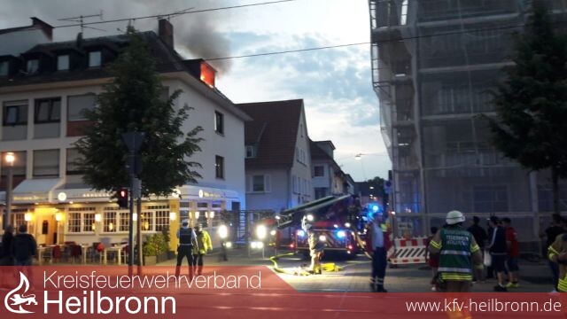 Vor Ort schlugen die Flammen bereits aus einer Dachgaube im 3. Obergeschoss eines Mehrfamilienhauses mit untenliegender Gaststätte. Alle Bewohner sowie die Gaststättenbesucher hatten das Gebäude bereits verlassen.