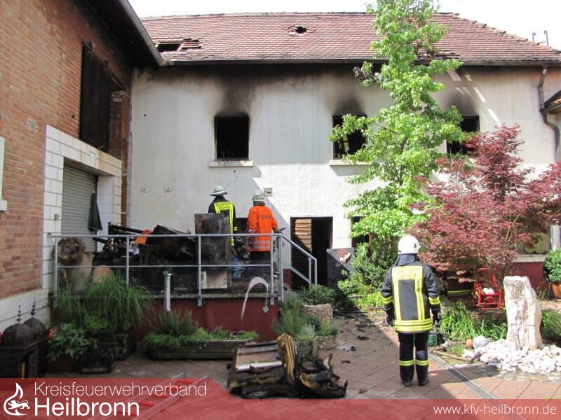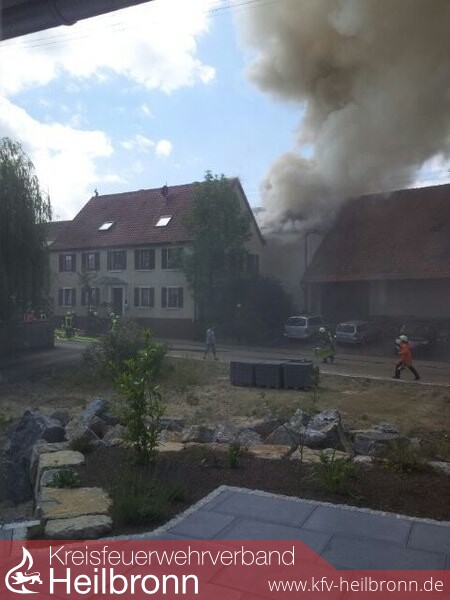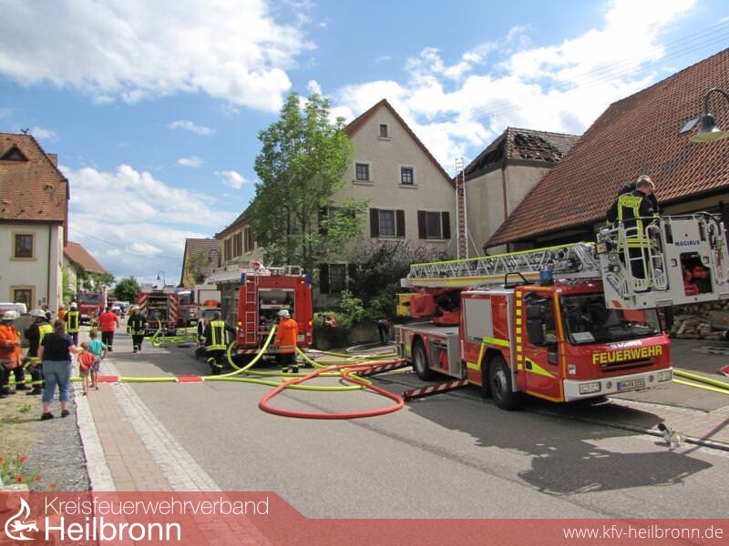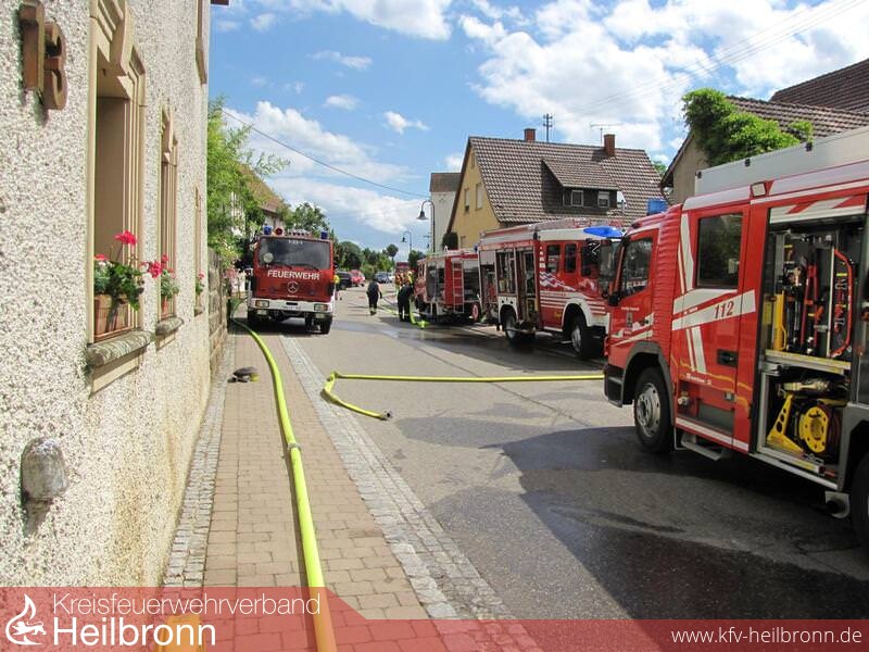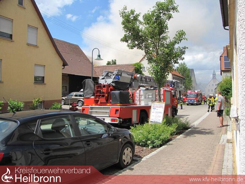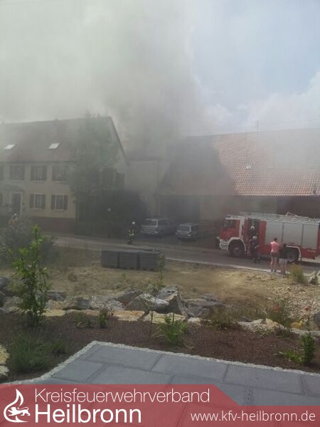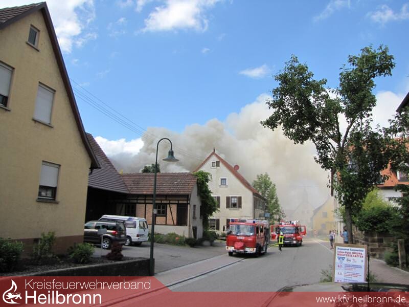 Die Feuerwehr wurde zu einem Brand mit Rauchentwicklung aus Dachstock in den Oedheimer Ortsteil Degmarn alarmiert. Vor Eintreffen war bereits aus 3km Entfernung eine starke Rauchentwicklung sichtbar. Aufgrund der nicht ausreichenden Wasserversorgung wurde bereits auf der Anfahrt der Löschzug Bad Friedrichshall mit Schlauchwagen SW2000 zur Ergänzung dazu alarmiert. Beim Eintreffen stellte sich heraus, dass der Mittelbau des Areals im Vollbrand stand und der Brand auf das direkt angebaute Wohnhaus, die im Hinterhof befindliche Scheune und die Richtung Rathaus direkt angebaute Scheune überzugreifen drohte. In den beiden Scheunen und im Wohnhaus wurde je ein Trupp zur Kontrolle unter Atemschutz eingesetzt. In der Scheune Richtung Rathaus befanden sich 25 Hühner die nicht direkt betroffen waren. Im betroffenen Mittelbau wurde ein Trupp im Innenangriff eingesetzt und 3C-Rohre von außen über die Fenster vorgenommen. Die Drehleiter Bad Friedrichshall wurde zur Brandbekämpfung zwischen Mittelbau und Scheune im Hinterhof eingesetzt um die betroffene Dachhaut zu öffnen. Im weiteren Verlauf wurde aufgrund der unzureichenden Wasserversorgung der Schlauchwagen und die Drehleiter, sowie ein weiteres Hilfeleistungslöschfahrzeug aus Neckarsulm dazu alarmiert. Der Schlauchwagen Bad Friedrichshall verlegte eine Wasserversorgung vom Kocher. Diese wurde von Oedheim durch eine Verstärkerpumpe an der Brunnensteige unterstützt. Der Schlauchwagen Neckarsulm stellte eine Wasserversorgung vom Gewächshaus Reuss zur Einsatzstelle her. Aufgrund des großen Bedarfs an Atemschutzgeräten und -Flaschen wurde der Gerätewagen Atemschutz Heilbronn nachalarmiert, welcher am Ortseingang einen Atemschutzplatz einrichtete. Die Abrollbehälter Wasser aus Neckarsulm und Heilbronn wurden ebenfalls alarmiert um die Zeit bis zum kompletten Aufbau der Wasserversorgung zu überbrücken. Das Hilfeleistungslöschfahrzeug Heilbronn und das Tanklöschfahrzeug Bad Friedrichshall unterstützten das Hilfeleistungslöschfahrzeug Oedheim im Innen- und Außenangriff über den Hof zum Mittelbau und lösten die Atemschutzträger ab. Nach der Meldung Brand aus wurden die Einsatzkräfte aus Bad Friedrichshall, Neckarsulm und Heilbronn aus dem Einsatz herausgelöst. Die Aufräumarbeiten wurden von Oedheim unter Atemschutz übernommen. Der Einsatzleitwagen 2 des Landkreises war zur Dokumentation und Einsatzkoordination ebenfalls an die Einsatzstelle gerufen worden. Danach wurde eine Brandwache eingerichtet. Ab 22.06.2013 21:00 Uhr übernahm diese die Abteilung Degmarn. Die Brandwache wurde am 23.06.2013 um 06:30 Uhr aufgelöst und die Einsatzstelle an die Polizei übergeben.