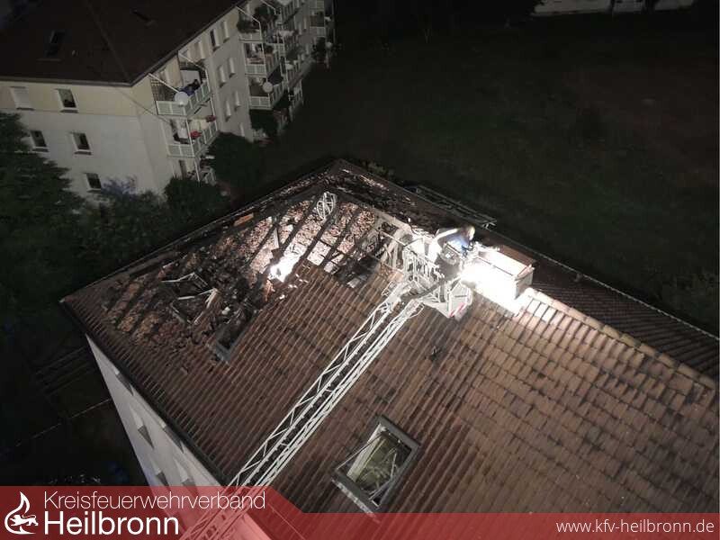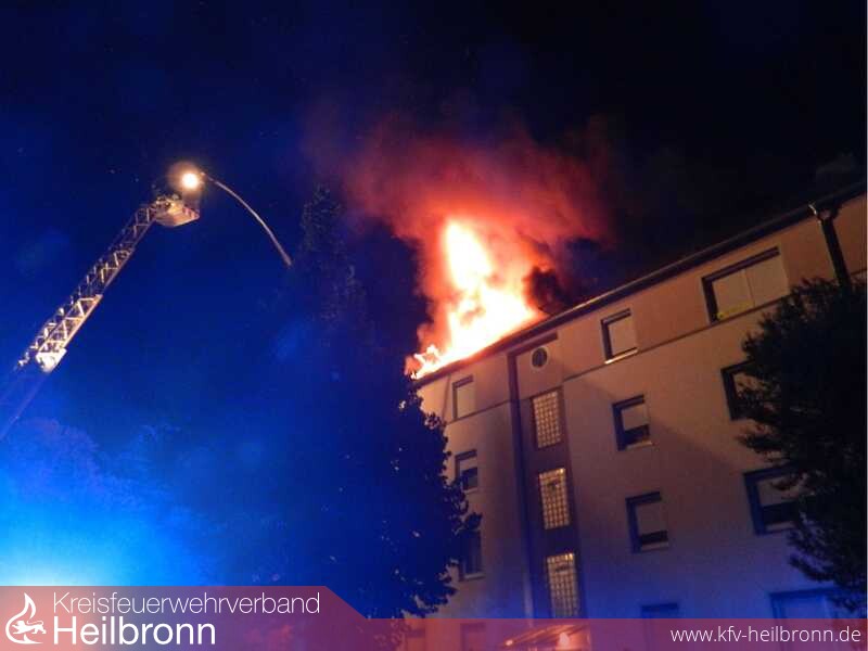 Beim Eintreffen der ersten Einsatzkräfte vor Ort, schlugen Flammen aus dem Dach eines viergeschossigen Mehrfamilienwohnhauses.