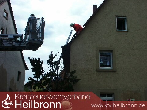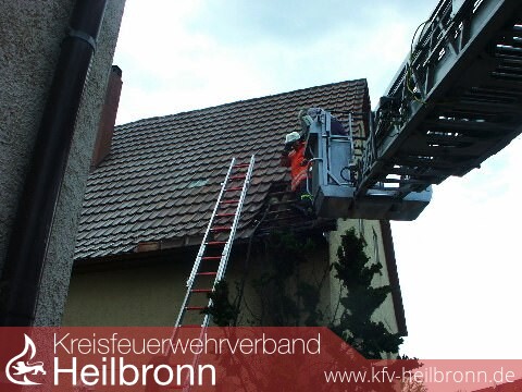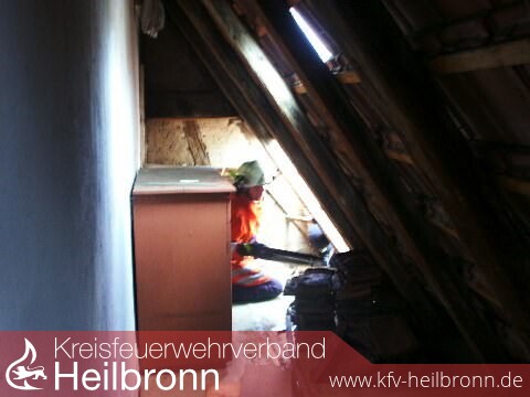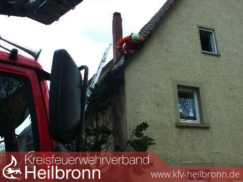 Beim Eintreffen der Feuerwehr war das Feuer außen von einen Nachbar mit einem Gartenschlauch weitgehendst gelöscht. Im Dachgeschoss brannte eine kleine Fläche mit Dachlatten und Sparren, welche mit einer Kübelspritze gelöscht wurden. Zur Kontrolle mussten Ziegeln in einer Fläche von ca. 2 m² abgedeckt werden.