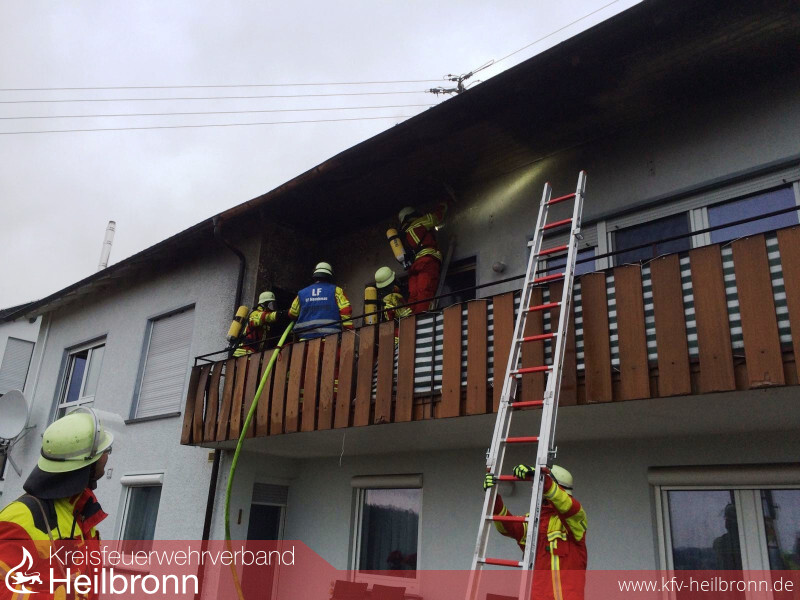 Ein zweiter Trupp begann auf der Gebäuderückseite mit einem Außenangriff und löschte die Flammen auf dem Balkon. Nachdem dieser Trupp die sichtbaren Flammen auf dem Balkon soweit abgelöscht hatte, ging er, ebenfalls unter Atemschutz, über die Steckleiter auf den Balkon vor. Hier war es notwendig die hölzerne Verkleidung zum Dach hin aufzusägen, um dort Nachlöscharbeiten durchzuführen.