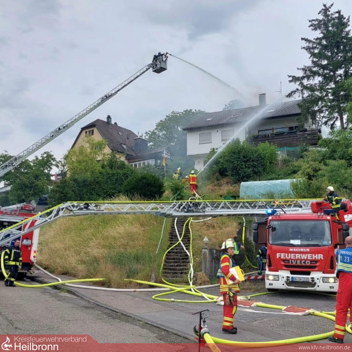 Das Haus steht auf einem Hang. Die Drehleitern wurden voll auf 23 Meter ausgefahren und reichten knapp aus, um das Feuer zu bekämpfen, erklärte Uwe Thoma, stellvertretender Kreisbrandmeister im Landkreis Heilbronn. Der Brand brach vermutlich auf einem Balkon unterhalb des Daches aus, die Ursache ist unbekannt. Die Polizei schätzt den Schaden auf rund 300.000 Euro.