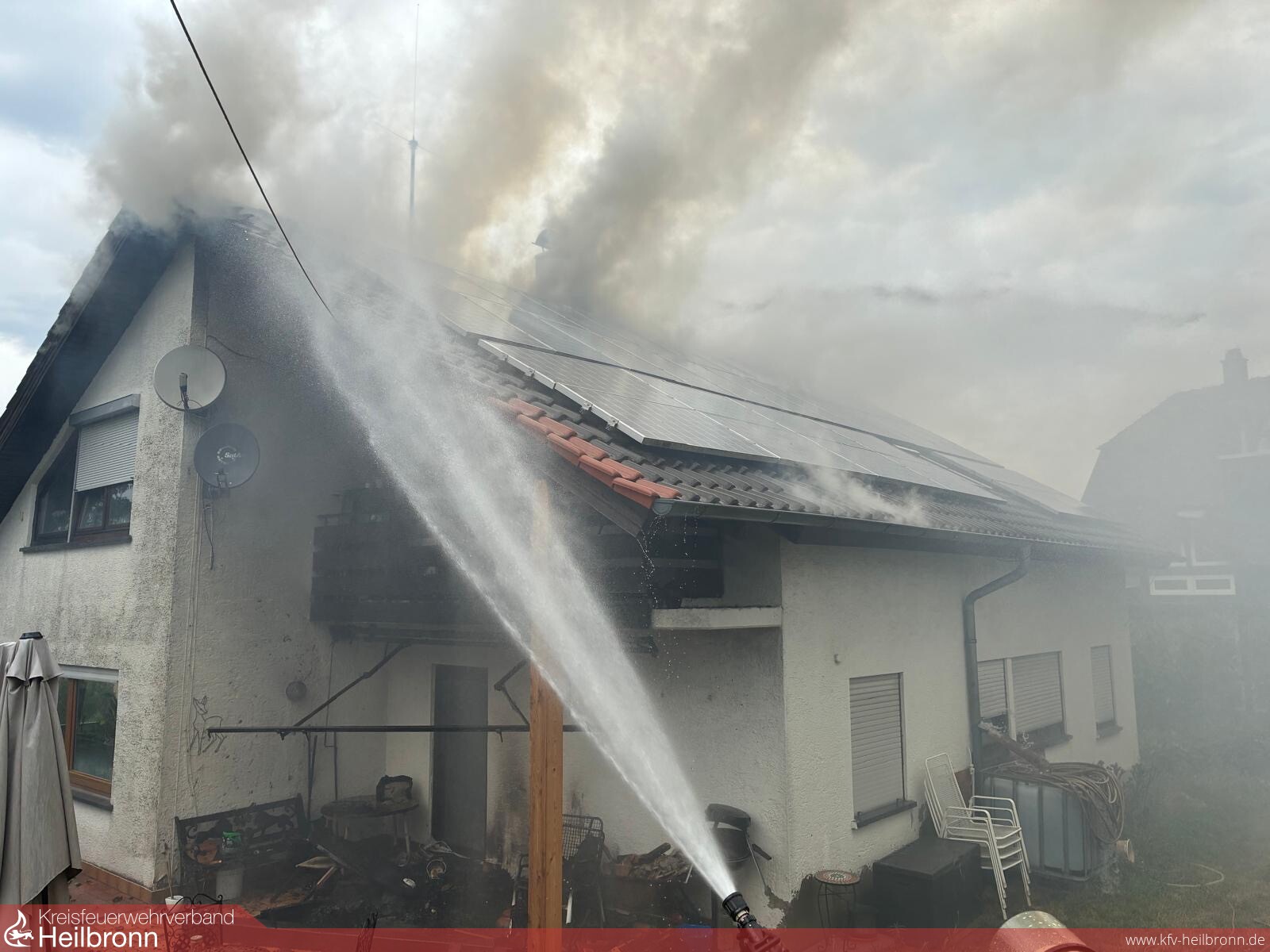 Die Feuerwehren Löwenstein und Obersulm wurden am Sonntag um 13:41 Uhr zu einem gemeldeten Dachstuhlbrand in den Löwensteiner Ortsteil Reisach alarmiert. Bereits auf der Anfahrt war eine deutliche Rauchwolke sichtbar. Aufgrund der Hanglage des Gebäudes und der erforderlichen Löschwasserversorgung wurden vom Einsatzleiter umgehend die Feuerwehren aus Wüstenrot, mit einem Halbzug und die Abteilung 2 aus Obersulm mit der Wasserförderungskomponente nachalarmiert. Durch einen massiven Löschangriff mit mehreren Rohren im Innen- und Außenangriff konnte das Feuer schnell unter Kontrolle gebracht werden. Die Bewohner konnten mit Hilfe der Feuerwehr das Gebäude unverletzt verlassen. Aufgrund der Brandausbreitung im Dachgeschoss waren zeitintensive Nachlösch- und Ausräumarbeiten erforderlich, was einen hohen Bedarf an Atemschutzgeräten zur Folge hatte, dieser wurde duch den AB Atemschutz sichergestellt. Da sich auf der rückwärtigen Dachseite eine PV-Anlage befand wurde die Fachgruppe Elektrotechnik der Feuerwehr Neckarsulm zur Erdung und Abschaltung der Anlage angefordert.