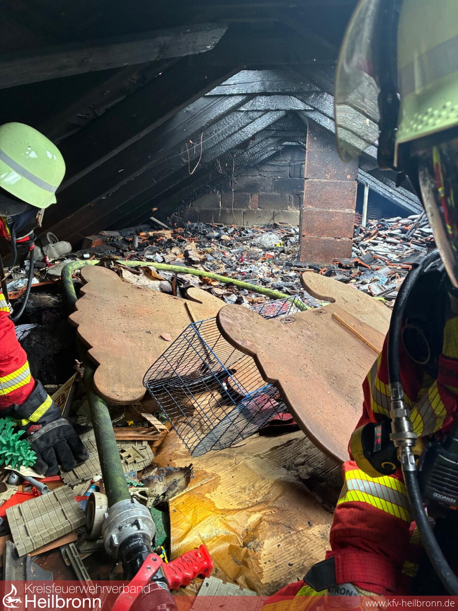 Durch massive Löscharbeiten verhinderte die Feuerwehr ein Übergreifen der Flammen. Die Flammen fraßen sich aber ins Innere des Dachstocks, in dem zahlreiche Gegenstände lagerten.“. Der DRK-Ortsverein aus Löwenstein kümmert sich um die Versorgung der Einsatzkräfte.