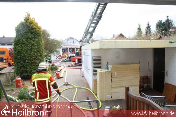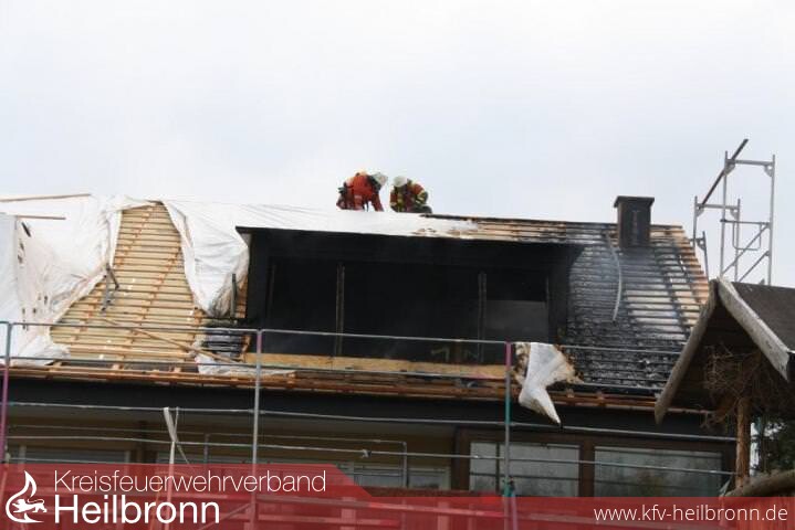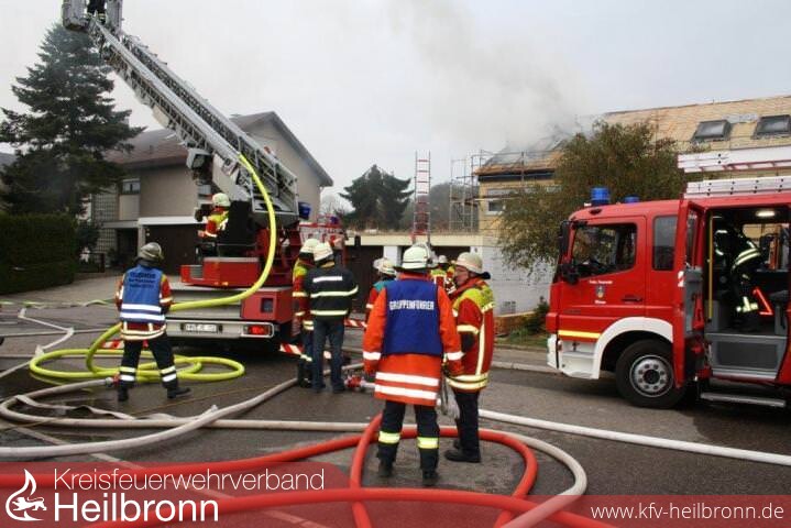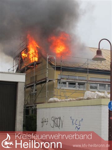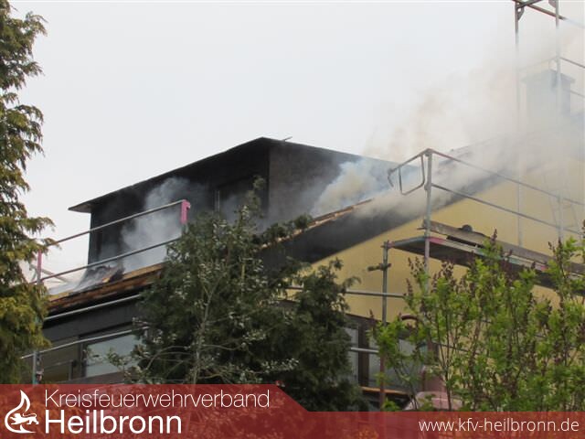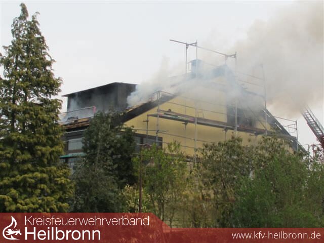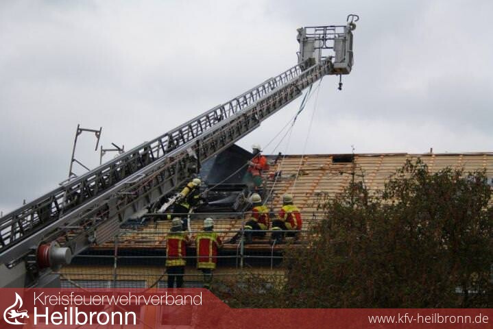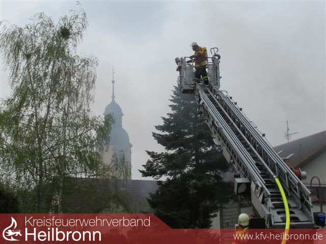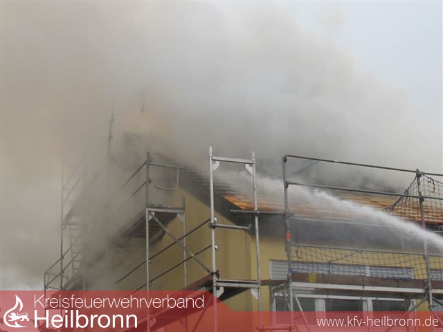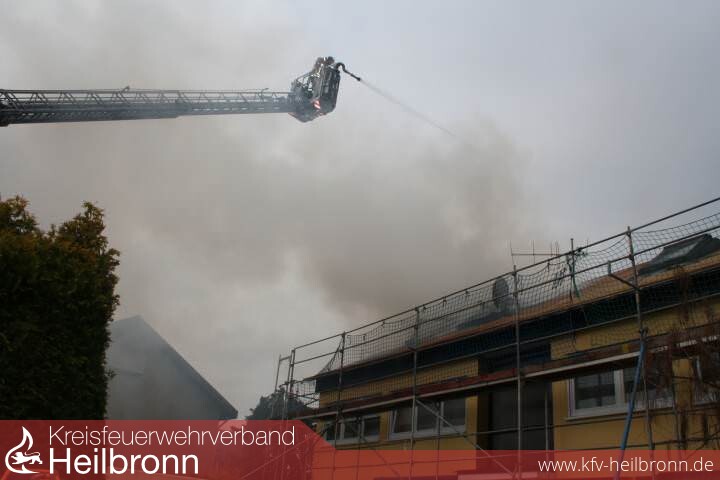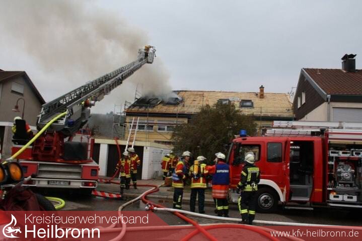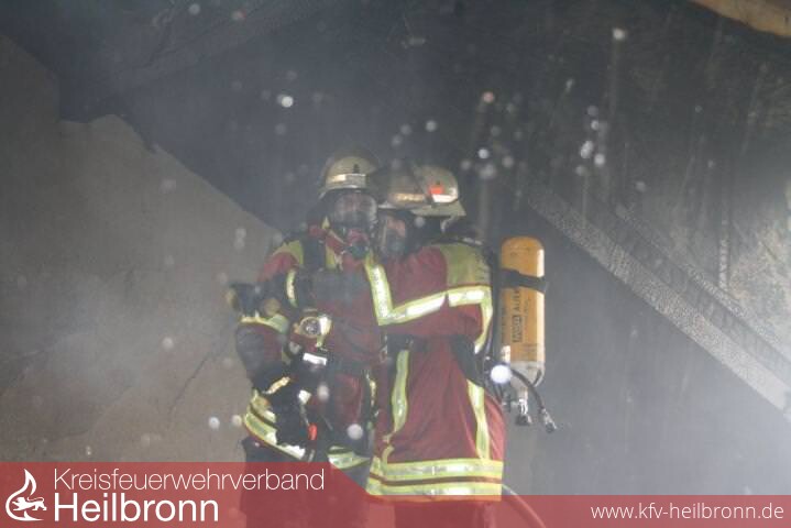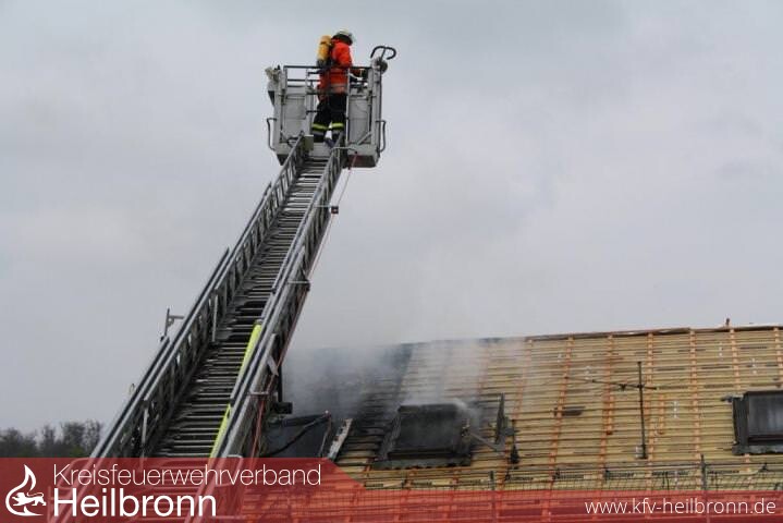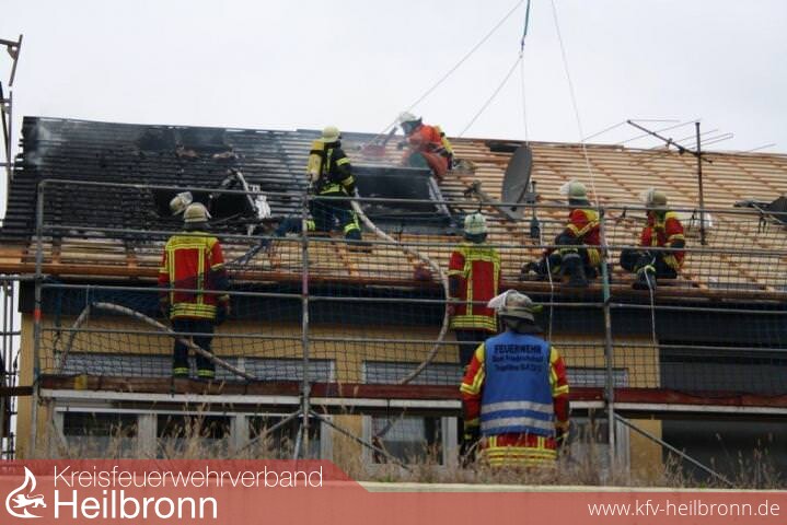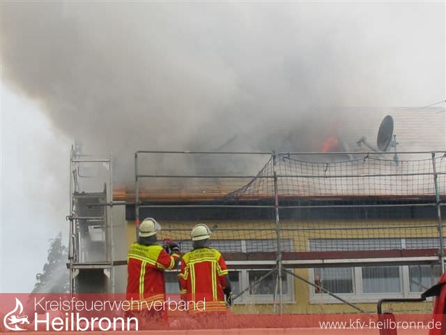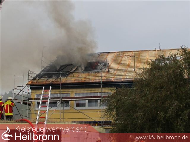 Nach der Alarm- und Ausrückeordnung wurde nach Eingang des Notrufs bei der Integrierten Leitstelle neben der Feuerwehr Offenau gleichzeitig die Feuerwehr Bad Friedrichshall alarmiert. Beim Eintreffen der Einheiten stand der Dachstuhl in Vollbrand. Zwei der Dachdeckerarbeiter befanden sich noch auf dem Dach und versuchten mit einem Wasserschlauch zu löschen. Dabei zogen sie sich Rauchgasverletzungen zu.