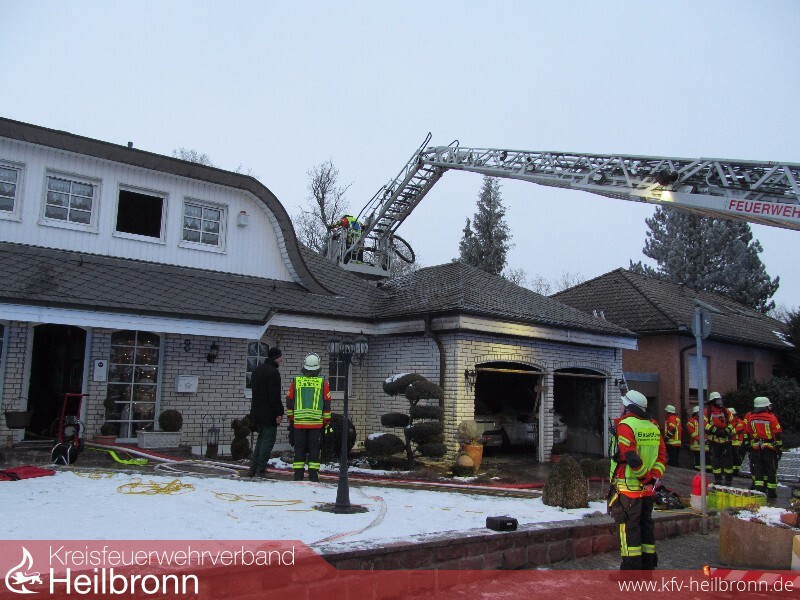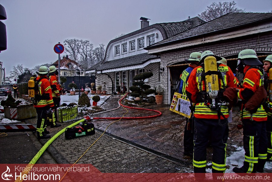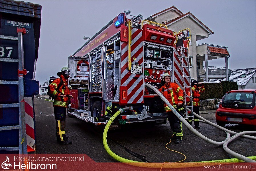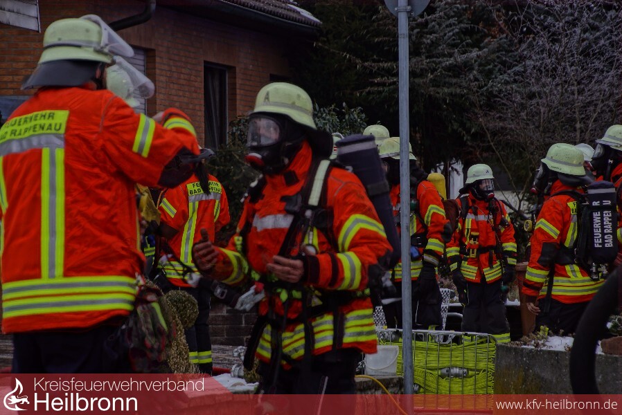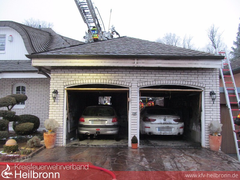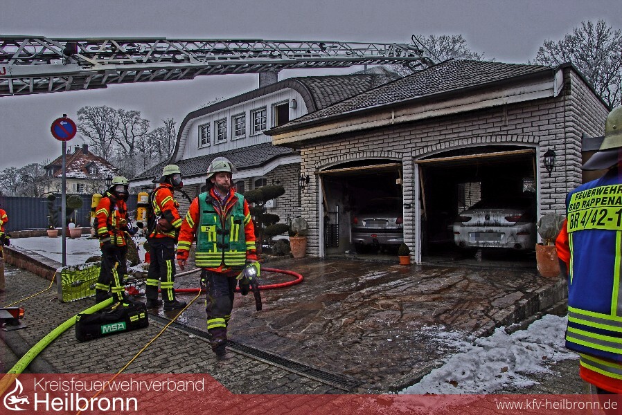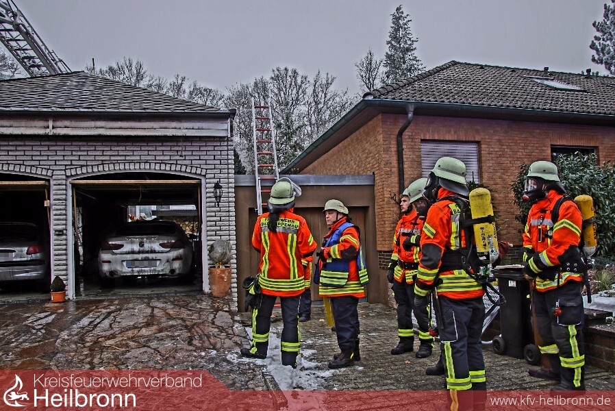 Zu einem Brand in einer Garage wurde die Abteilung Bad Rappenau um 15:18 Uhr alarmiert. Beim Eintreffen der Feuerwehr brannte es in und neben einer Doppelgarage. Der Brand hatte bereits auf die Dachkonstruktion des direkt angrenzenden Wohnhaus übergegriffen. Die Bewohner hatten das Gebäude bereits verlassen. Durch den Einsatzleiter wurden daraufhin die Abteilungen Fürfeld und Bonfeld sowie der ELW 1 aus Heinsheim alarmiert. Der erste Angriff wurde durch das Wohnhaus hindurch an der Garagenrückseite mit einem C-Rohr vorgetragen. Das 1. Obergeschoss war bereits stark verraucht. Hier wurde ein weiterer Trupp zur Brandbekämpfung eingesetzt. Über die Drehleiter wurden mit einer Rettungssäge sofort die betroffenen Dachflächen geöffnet. Durch das schnelle, energische und gezielte Vorgehen konnte der Brand schnell unter Kontrolle gebracht werden und weiterer Schaden verhindert werden. Nur wenige Minuten später wäre der Dachstuhl des Wohnhauses in Flammen gestanden. Ein auf der Straße abgestellter Container stand direkt auf einem Unterflurhydrant, dies verzögerte den Aufbau der Wasserversorgung erheblich. Zum Öffnen der Verkleidungen inner- und außerhalb des Gebäudes mussten mehrere Trupps unter Pressluftatmer eingesetzt werden. Das Einfamilienhaus wurde mit Elektrolüftern entraucht. Mit einem Mehrgasmessgerät wurden die Kohlenstoffmonoxidkonzentrationen in den Räumen gemessen.