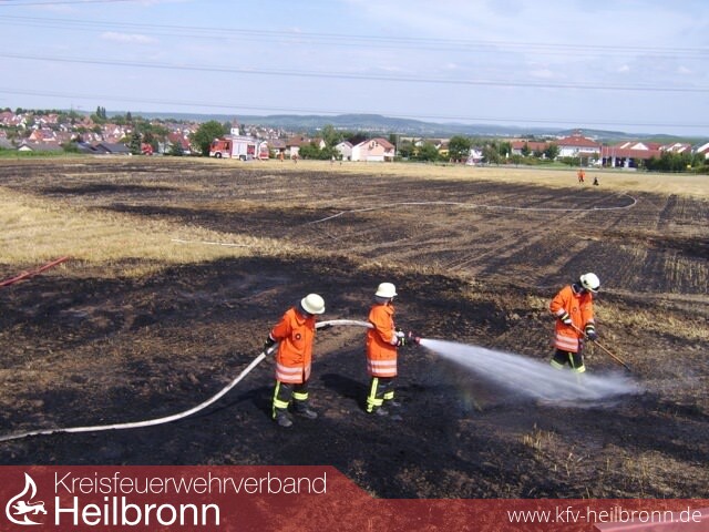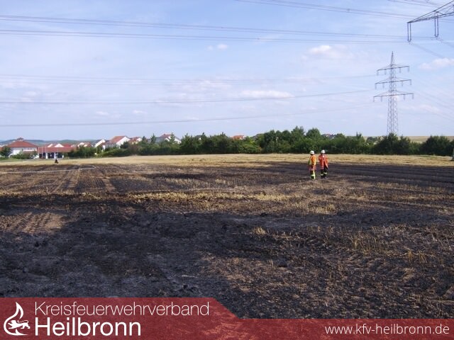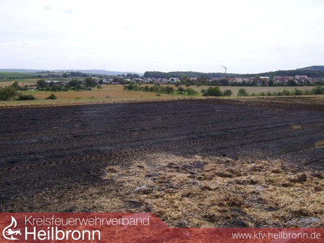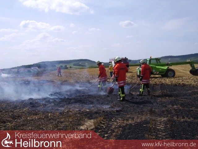 Da die Einsatzstelle ca. 200m vor dem Feuerwehrhaus lag war die Anfahrt entsprechend kurz. Sofort wurde von zwei Löschfahrzeugen je eine Angriffsleitung vorgenommen. Ein Landwirt hat bereits damit begonnen den Brand durch grubbern einer Schneise einzudämmen. Da bereits in der Anfangszeit abzusehen war, das für die Brandbekämpfung weitere Löschfahrzeuge benötigt werden, wurde über die Heilbronner Feuerwehrleitstelle Verstärkung nachgefordert. Da die Feuerwehr Brackenheim gerade auf dem Rückweg von einem Verkehrsunfall in der Nähe war fuhr diese mit zwei weiteren Löschfahrzeugen die Einsatzstelle an.