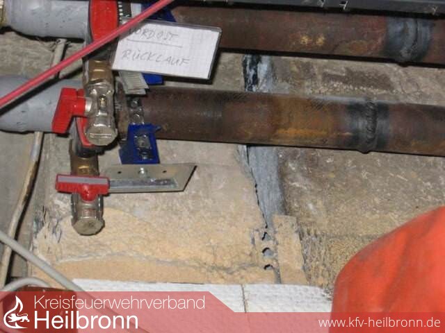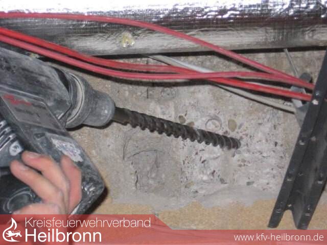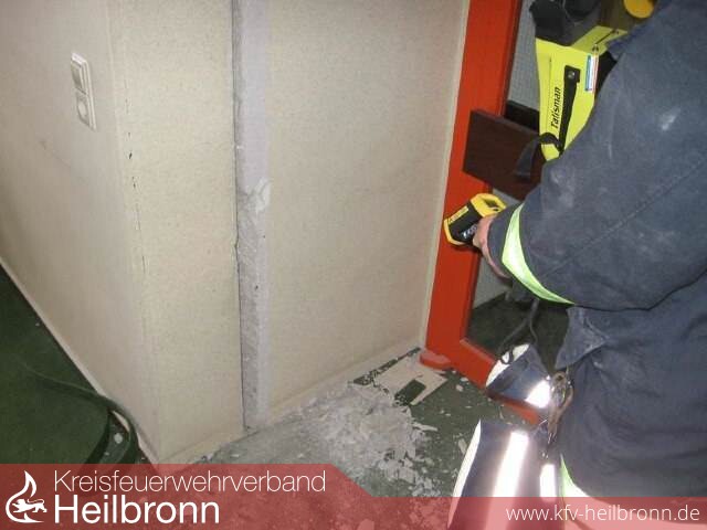 Tätigkeit: Anhand der über Handy eingegangenen Meldung wurde von der Leitstelle in Heilbronn nach Alarmplan nur die Kleineinsatz- und Führungsschleife alarmiert. Nach der ersten Erkundung wurde aufgrund der unklaren Lage sofort die Tagschleife nachalarmiert, sowie die Wärmebildkamera aus Heilbronn angefordert. In allen Geschoßen wurde ein C-Rohr von den dortigen Wandhydranten bereitgelegt. Im Erdgeschoß und im 1 Obergeschoß wurden mehrere Wanddurchbrüche mit Bohrhämmern hergestellt und die Dehnfuge ausgeräumt. Nach dem Ausräumen wurde dann eine Schaummittel-Wasserlösung in die Fuge eingelassen. Über die ganze Einsatzzeit wurden die Arbeiten mit der nachgeforderten Wärmebildkamera und dem Thermofühler durch einen Feuerwehrkameraden der Berufsfeuerwehr Heilbronn begleitet.