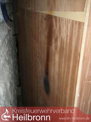 Ein umgehend verständigter Schreiner baute den Wandschrank fachgerecht aus. Dahinter kam ein stark verkohlter und auf eine Länge von 60 cm verbrannter Balkenkopf zum Vorschein. Dieser hatte bereits die Rückwand des Schrankes angesengt.