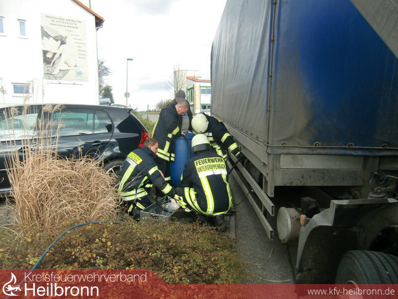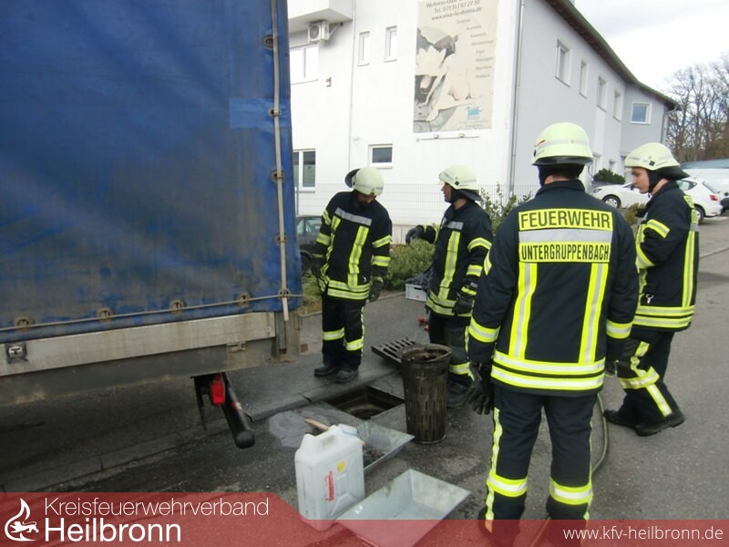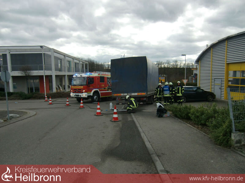 Die Feuerwehr dichtete die umliegenden Einlaufschächte unmittelbar nach Eintreffen an der Einsatzstelle mittels Dichtkissen ab und verschloss die Kraftstoffleitung am LKW. Im weiteren Verlauf wurde mit Unterstützung des RW-Öl der Berufsfeuerwehr Heilbronn der restliche Tankinhalt leergepumpt.Weiter wurde die Verkehrsfläche mittels Ölbindemittel abgestreut und die Kanalisation gespült.