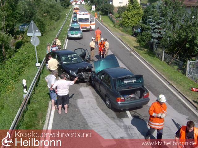 Zwei Schwer- und eine Leichtverletzte mussten am Freitagmorgen nach einem Unfall in Wüstenrot-Finsterrot ins Krankenhaus gebracht werden. Eine 26-Jährige fuhr gegen 9.30 Uhr mit ihrem BMW auf der Ortsdurchfahrt, der B 39, in Richtung Löwenstein. Aus bislang ungeklärter Ursache geriet ihr Fahrzeug auf die Gegenfahrspur und stieß dort frontal mit dem Seat einer entgegenkommenden 56-Jährigen zusammen. Durch die Wucht des Zusammenpralls wurde die BMW-Fahrerin im Wrack ihres Fahrzeugs eingeklemmt, konnte aber noch vor dem Eintreffen der alarmierten Freiwilligen Feuerwehr von einem Verkehrsteilnehmer befreit werden. Sie wurde mit dem Rettungshubschrauber ins Krankenhaus geflogen. Im Seat wurde die in Mainhardt wohnhafte Fahrerin leicht verletzt. Ihr 58-jähriger Beifahrer war nicht angegurtet und erlitt durch den Aufschlag an der Windschutzscheibe nicht unerhebliche Kopfverletzungen. An beiden PKW entstand Totalschaden in einer Gesamthöhe von über 20.000 Euro.