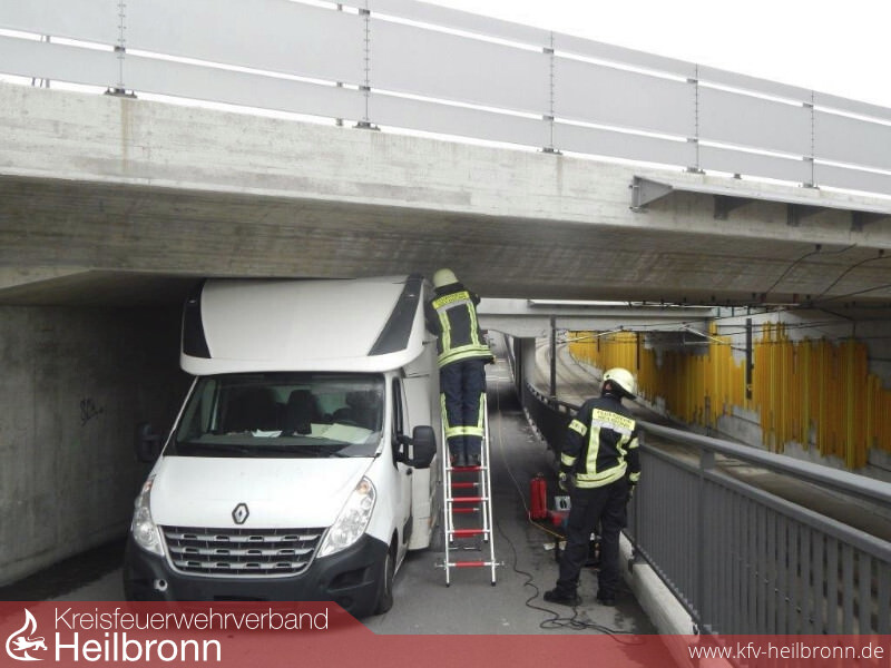 Was bei der ersten Brückenunterführung noch gut gegangen war, endete schließlich bei der zweiten Durchfahrt, wo das Fahrzeug schließlich eingeklemmt zum Stehen kam.