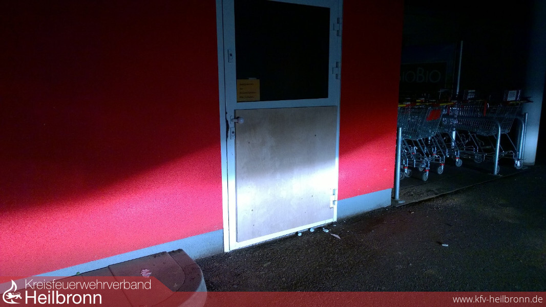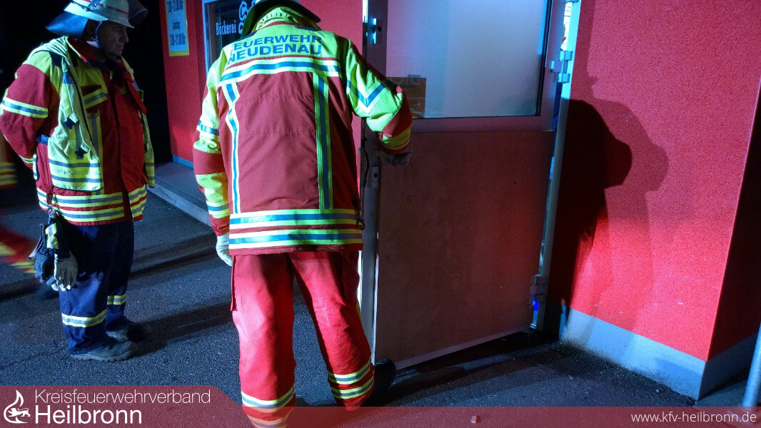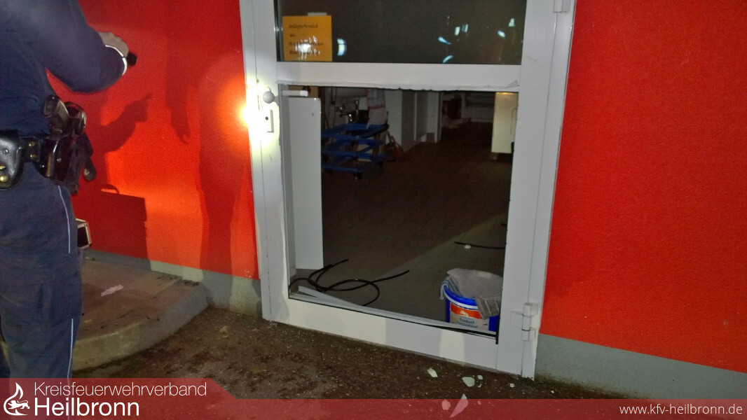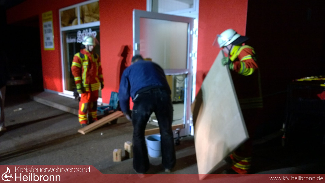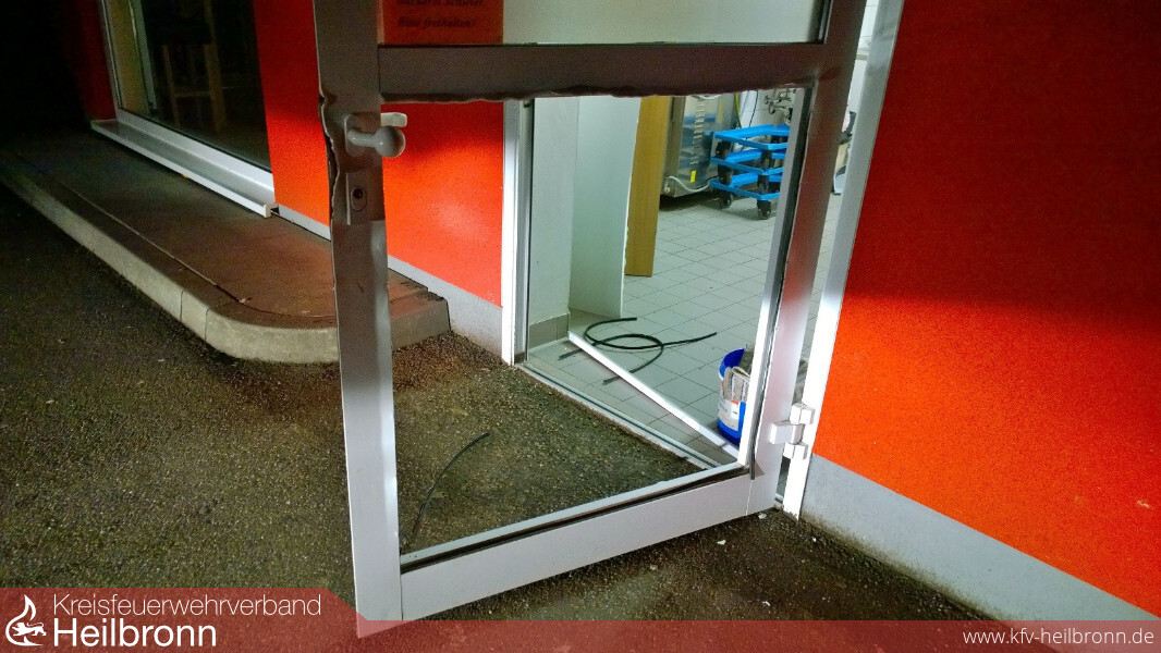 Zur Notverschalung wurde die „kleine Schleife“ der Einsatzabteilung Neudenau alarmiert. Zuvor hatten Einbrecher versucht über mehrere Wege in eine Bäckereifiliale einzudringen. Mit brachialer Gewalt gelang es ihnen letztendlich, indem sie das untere Segment einer Türe total entfernten. Anwohner wurde durch den Lärm aufmerksam und verständigten die Polizei. Bis zum Eintreffen der Polizei hatte(n) der oder die Täter bereits das Weite gesucht. Beute konnten die Einbrecher nicht machen, weil in der Bäckereifiliale nach Ladenschluss kein Geld zurückbleibt.