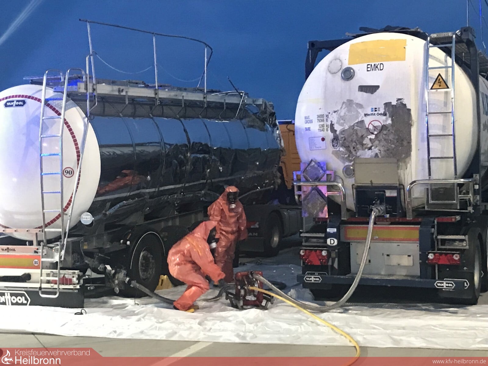 Gestern konnte die Feuerwehr Heilbronn wieder auf einen abwechslungsreichen Tag zurückschauen. Zwei Alarme durch Brandmeldeanlagen eine Tierrettung mit der Drehleiter sowie eine Ölspur um 01.45 Uhr waren weniger spektakulär. Zwei andere Einsätze forderten die Einsatzkräfte jedoch mehr. Zum einen gab es auf der Autobahn 6 Richtung Nürnberg einen Zusammenstoß von Sattelzügen. Personen wurden nicht eingeklemmt. Dennoch mussten 21 Tonnen einer Chemikalie in andere Tankfahrzeuge umgepumpt werden. Gute Unterstützung leistete hierbei die BASF Werkfeuerwehr, welche im Rahmen der TUIS (Transport-Unfall-Informations- und Hilfeleistungssystem) tätig wurde. Hierfür herzlichen Dank nach Ludwigshafen. Gegen 22.41 Uhr hatte eine Person im Neckar sein Überleben einem Bekannten zu verdanken. Aus nicht bekannter Ursache war der Mann bei der Friedrich-Ebert-Brücke ins Wasser gestürzt und mehrfach untergegangen. Der Bekannte schaffte es zwar die Person am flacheren Ufer zu sichern, konnte ihn aber nicht an Land bringen. Schwimmretter der Feuerwehr retteten die Beiden kurz nach dem Eintreffen aus der lebensbedrohlichen Situation.