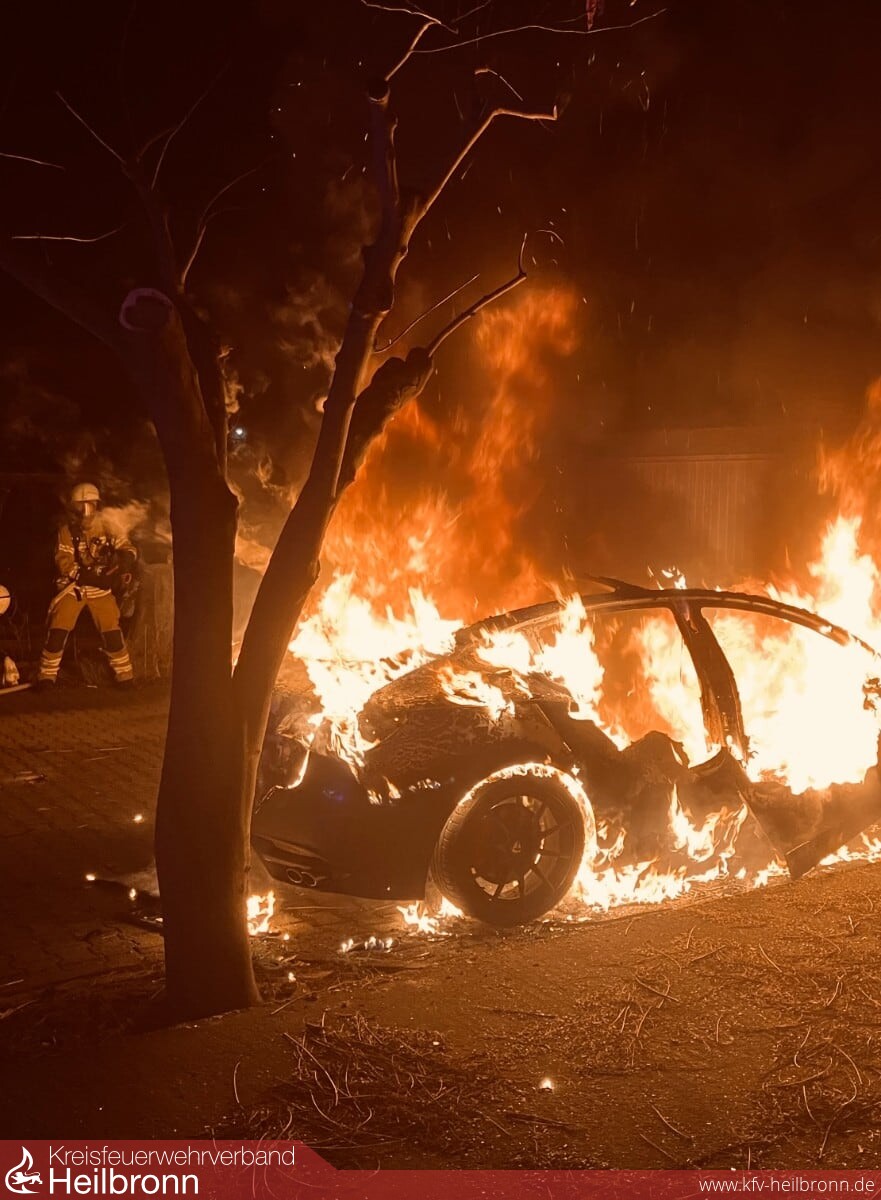 Mit dem Stichwort „Rauchentwicklung Wohngebäude“ wurde der Löschzug um 02.12 Uhr in die Lessingstraße alarmiert. Bereits auf der Anfahrt erhielten die Einsatzkräfte die Information, dass ein Elektroauto vor einem Gebäude in Vollbrand stehen würde. Dieses Lagebild bestätigte sich beim Eintreffen der ersten Kräfte vor Ort. Die Brandbekämpfung und Kühlung des Fahrzeugs wurden mit 2 C-Rohren durchgeführt. Parallel hierzu fragte die Leitstelle für Feuerwehr und Rettungsdienst bei der Werkfeuerwehr Audi und einem Bergungsunternehmen nach einem Abrollbehälter-Hochvolt (AB-HV/ dichte, mit Wasser auffüllbare Mulde) an. Da der Brand jedoch schnell unter Kontrolle gebracht werden konnte, war der Einsatz eines AB-HV nicht mehr erforderlich und der Abtransport konnte in einer gewöhnlichen Transportmulde erfolgen.