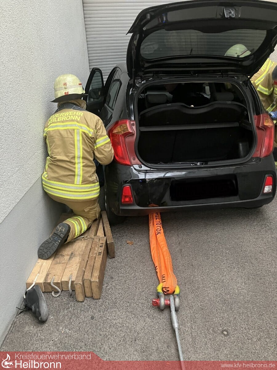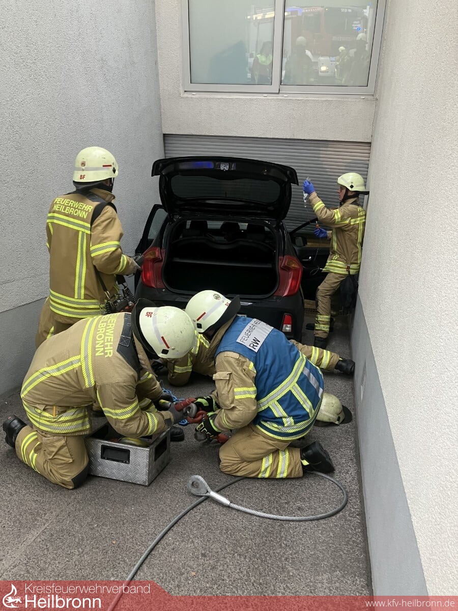 Zu einem spektakulären Einsatz ging es kurz vor 15 Uhr in der Titotstraße. Bei dem Versuch ein wegrollendes Auto in einer Tiefgarageneinfahrt zu sichern, geriet eine sich außerhalb davon befindliche Person zwischen das Fahrzeug und der Garagenwand. Der eingeklemmte Mann wurde erstversorgt und der Wagen mit Hilfe einer Seilwinde und Rüsthölzern vorsichtig weggezogen.