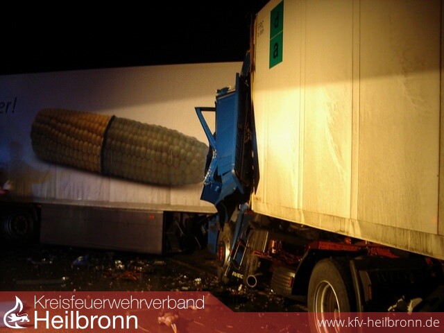 Nahezu ungebremst fuhr ein entgegenkommender Sattelauflieger auf den quer stehenden Auflieger auf, wobei das Führerhaus komplett eingedrückt wurde.
