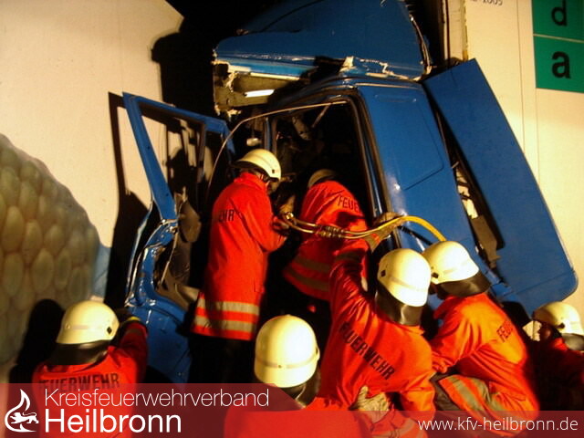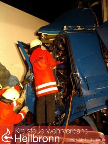 Die Feuerwehr Möckmühl musste mit Spreizer und Schere sowie Rettungszylindern den verunfallten Fahrer aus dem Fahrerhaus bergen.
