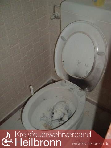 Die Bilder zeigen den Deckenbereich mit der geschaffenen Öffnung von oben, sowie den zu einem Klumpen zusammengeschmolzenen Heizlüfter, welcher von der Decke direkt in die Toilettenschüssel stürzte.