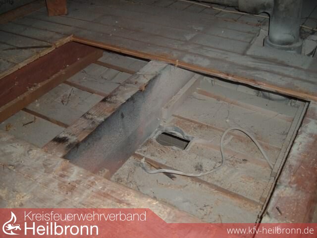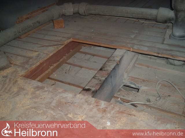 Beim Eintreffen an der Einsatzstelle kurze Zeit nach der Alarmierung waren bereits keine Flammen mehr sichtbar. Von der Feuerwehr wurde daraufhin der Deckenbereich über dem betreffenden Raum auf eventuell noch vorhandene Glutnester in der Zwischendecke kontrolliert. Hierzu war es nötig, einen Teil der Holzbohlen des darüber befindlichen Dachbodens zu entfernen.