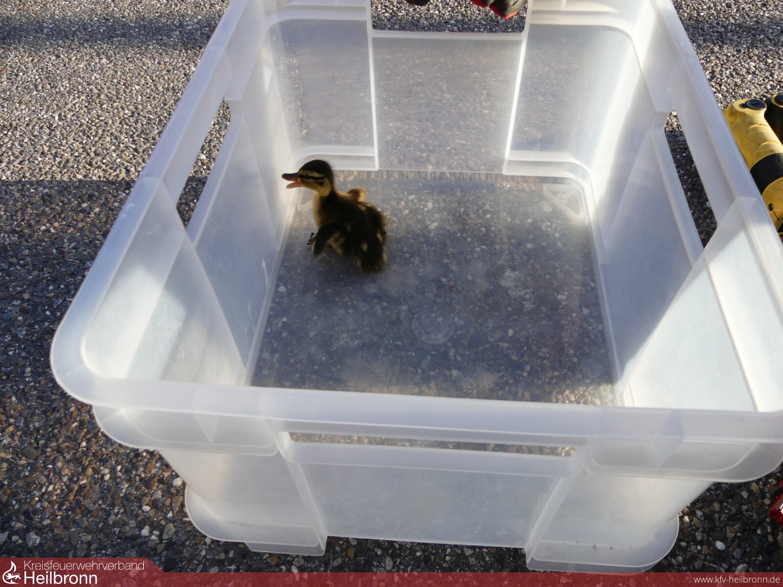 Unter kritischer Beobachtung der Entenmutter konnte das Küken in Zusammenarbeit mit der Tierrettung Unterland einfangen werden.