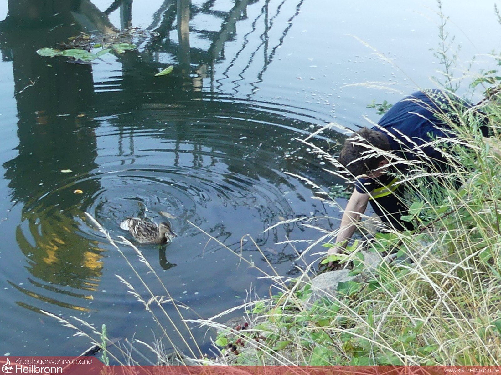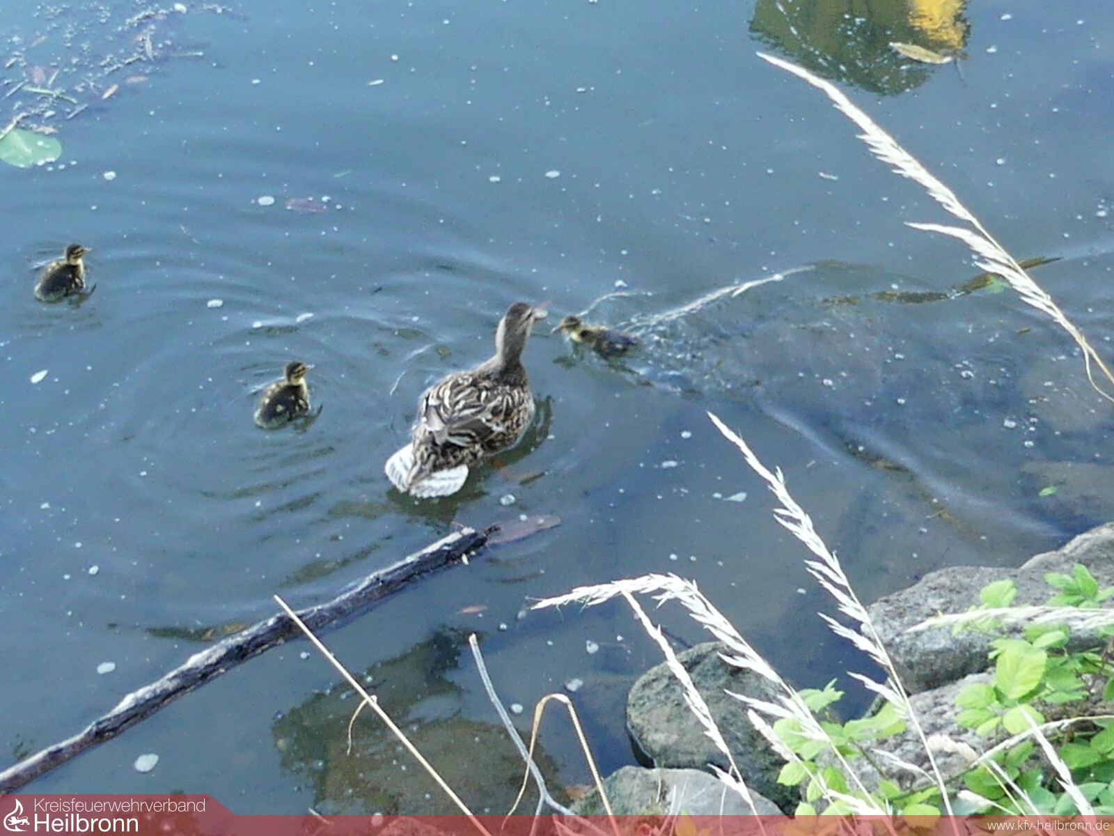 Nach der Rettung ging es dann in Begleitung der Ente zum naheliegenden Neckar, wo bereits weitere Jungtiere auf den Rest der Familie warteten.