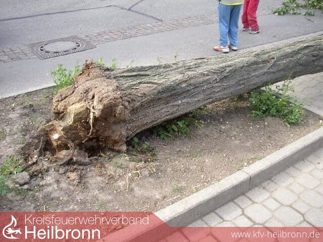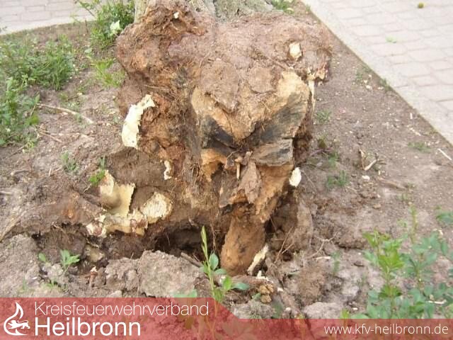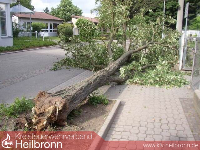 Lage: Durch heftige Winde wurde ein Baum vor dem Grundschulgebäude in Meimsheim entwurzelt und fiel dabei um. Der Bauhofleiter forderte die Feuerwehr zur Entfernung des umgestürzten Baumes an.