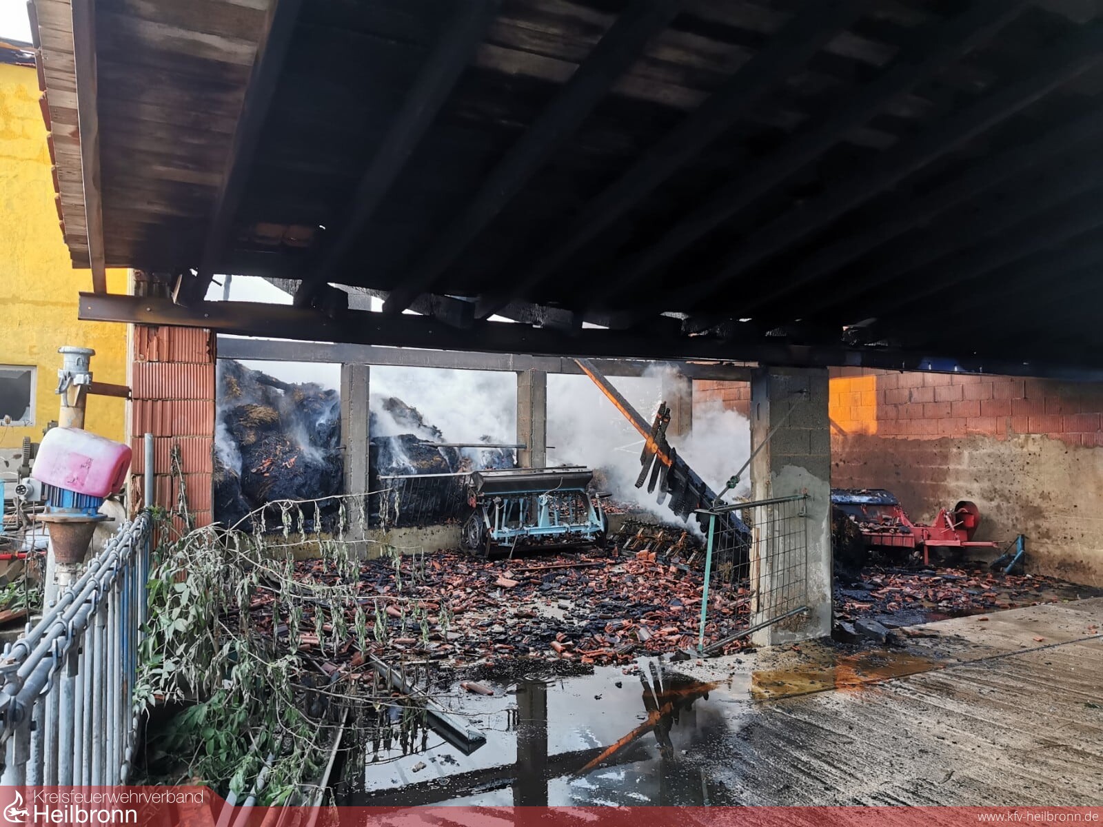 Es wurden zwei Einsatzabschnitte gebildet, welchen jeweils drei Löschfahrzeuge, ein ELW 1 sowie ein Abrollbehälter Tank/Wasser zugeteilt wurden. Weiter wurden ein Abschnitt Wasserversorgung sowie Atemschutzreserve eingeteilt und von einem Abschnittleiter geführt. Zur übergeordneten Koordination der 4 Einsatzabschnitte kam der Einsatzleitwagen 2 des Landkreises Heilbronn zum Einsatz. Über den gesamten Einsatzverlauf von rund 10 Stunden kamen 9 C-Rohre sowie ein Wenderohr über die Drehleiter zum Einsatz. Über das Feldbewässerungssystem der Landwirte sowie nahegelegenen Fischteichen, konnte eine Wasserversorgung aufgebaut und sichergestellt werden. Hierbei mussten Schlauchleitungen von insgesamt knapp 2 Kilometer verlegt werden. Die Scheune war bis unter das Dach mit Heuballen gefüllt und musste aufwendig durch Atemschutztrupps und mit Hilfe von drei Frontladern ausgeräumt, abgelöscht und auf Feldern verteilt werden. Dies machte einen enormen Bedarf an Atemschutzgeräteträgern erforderlich. Zur Unterstützung wurden deshalb weitere Geräteträger aus Neckarsulm und Gundelsheim nachalarmiert.