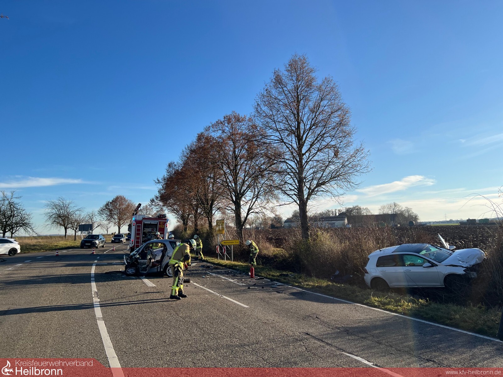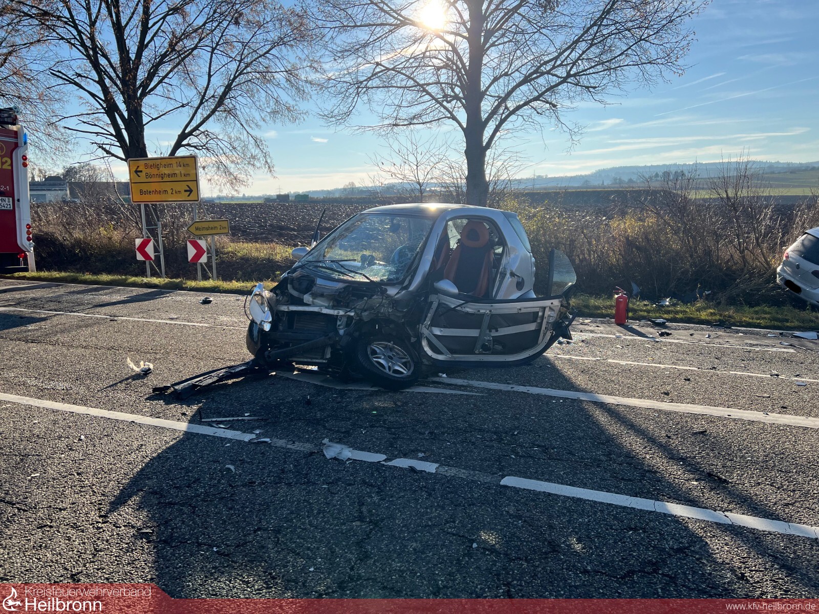 Begonnen hat der „Einsatztag“ um 13:22 Uhr mit einem Verkehrsunfall mit einer eingeklemmten Person an der Einmündung Meimsheim - Botenheim - Bönnigheim. Dort wurde ein Smart-Fahrer in seinem PKW eingeschlossen und von der Abteilung Ost mit hydraulischem Rettungsgerät befreit. Von der Abteilung Mitte wurde der zweite Rettungssatz bereitgestellt. Dies war übrigens der erste Einsatz des auf dem LF 10 der Abteilung Ost verlasteten Rettungssatzes. Der Rettungssatz auf diesem Fahrzeug ist seit knapp einem Jahr als dritter Rettungssatz in der Gesamtstadt einsatzbereit.