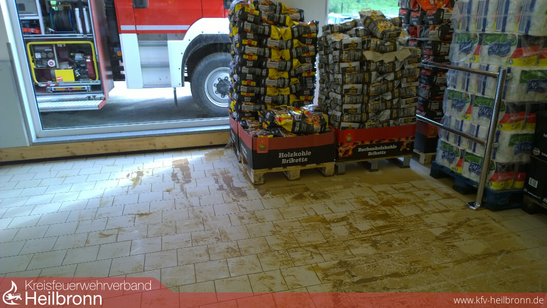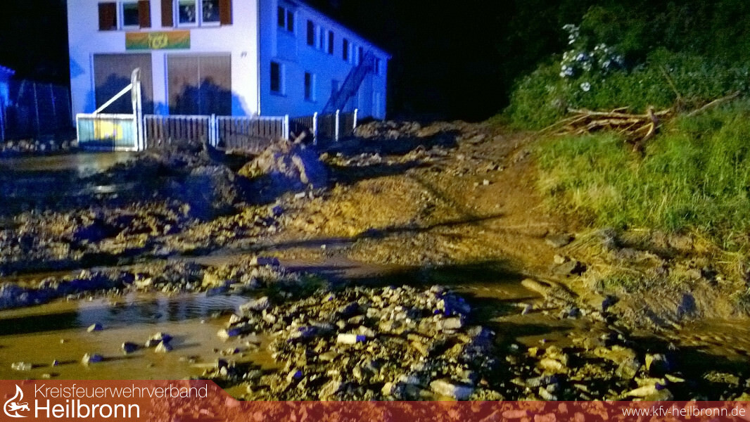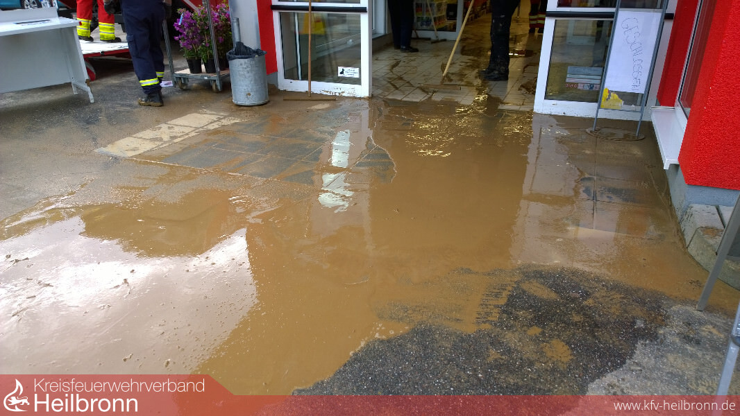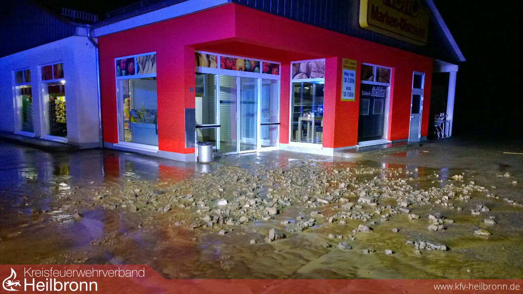 Wieder kam es an der Mündung von Eichklinge und Losklinge zur Überflutung der Landesstraße 1096 Richtung Siglingen. Wieder lief das Wasser in die Räume eines angrezenden Supermarktes. Wieder waren Straße und Parkplatz voller Schlamm und Geröll.
