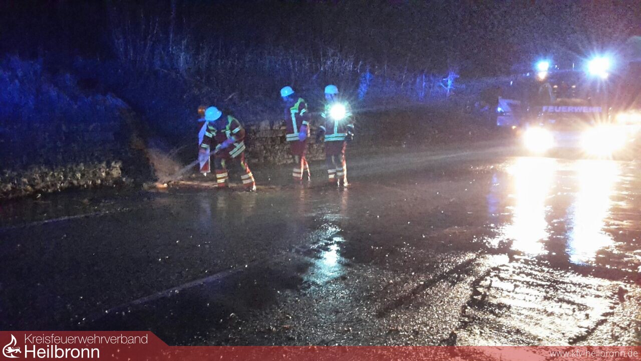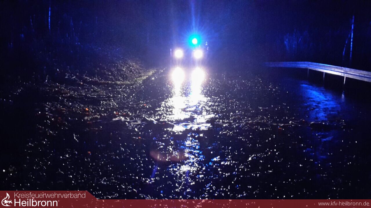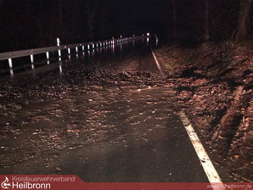 Die EA Siglingen wurde zur Straßenreinigung und Absicherung auf die L1096 zwischen Neudenau und Siglingen alarmiert. Die Landesstraße macht derzeit bei größerer Regenmenge sofort Probleme und wird an mehreren Stellen von Klingen überspült und dadurch teilweise unbefahrbar.