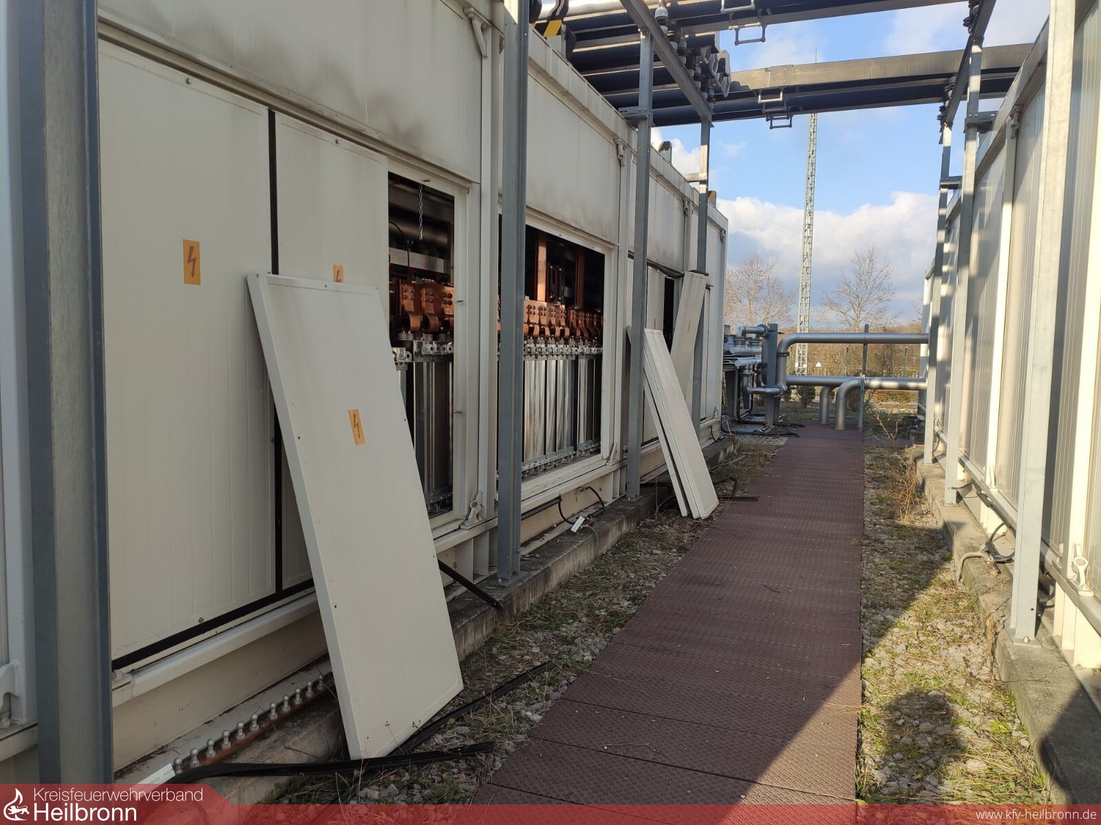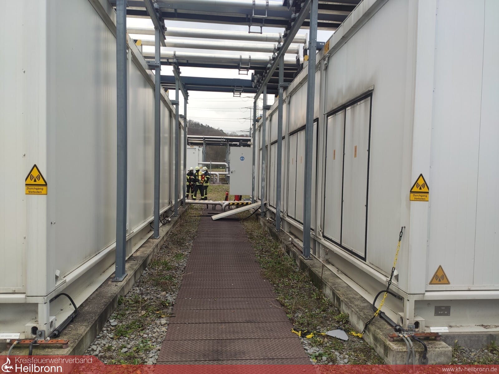 Die Rauchentwicklung wurde durchgehend beobachtet und währenddessen vor dem Zugang zum Gelände die Wasserversorgung aus dem Löschwasserbehälter aufgebaut. Von der Werkfeuerwehr GKN wurden weitere CO²-Feuerlöscher angefordert. Als der Notfallmanager den Zugang ermöglichte und die betroffene Anlage freigeschalten hatte, wurde die Erkundung auf dem Gelände fortgesetzt. Dabei wurde ein explodierter elektrischer Kondensator in einem der Umrichtercontainer festgestellt. Durch die Explosion des etwa 1 m hohen Kondensatorbehälters wurden die Wände des Containers herausgedrückt. Ein ähnliches Bild bot sich den Kräften bereits vor drei Jahren bei einem Einsatz an ähnlicher Stelle.