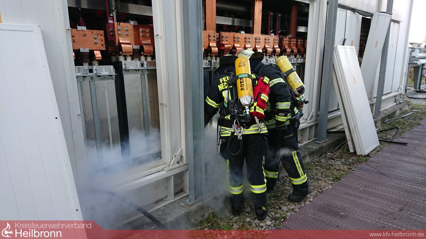 Die Feuerwehren Neckarwestheim und Lauffen wurden zu einem Brand in elektrischen Anlagen zum DB Bahnstromumrichter alarmiert. Da der Notfallmanager eine längere Anfahrt hatte, wurde das Gelände von Außen erkundet. Dabei wurde eine Rauchentwicklung in einem der beiden Umrichterbereiche festgestellt. Offenes Feuer war keines sichtbar und das Umrichterwerk ist auch nicht ständig von Personal besetzt, sodass erstmal keine Gefahr für Personen oder Brandausbreitung bestand.