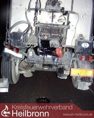 Infolge eines Auffahrunfalls zwischen einem LKW und einem LKW mit Bitumenanhänger auf der BAB A6 in Fahrtrichtung Mannheim im Baustellenbereich auf der Neckarbrücke, wurde die Fahrbahn der „LKW-Rinne“ (rechte Behelfsfahrspur) sowie das danebenliegende Baufeld mit ca. 2000 l Bitumen verunreinigt. Von der Feuerwehr Heilbronn wurde der Anhänger mit Keilen abgedichtet und die Fahrbahn gereinigt. Von der Feuerwehr Neckarsulm wurde die Einsatzstelle ausgeleuchtet, der Brandschutz sichergestellt und die Reinigung der Fahrbahn unterstützt.