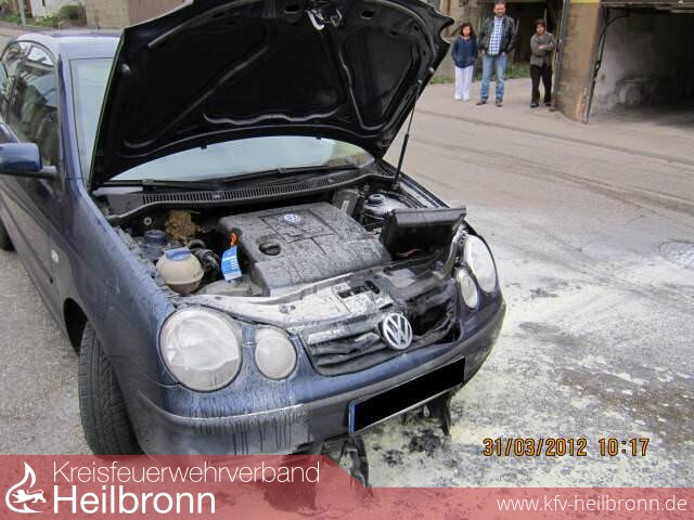 Mit seinem Auto war ein Fahrzeugbesitzer am Samstagvormittag, 31.03.2012, gegen 11.20 Uhr von seiner Wohnung in Cleebronn weggefahren, während auf der Fahrt bereits Unstimmigkeiten in der Laufleistung des Pkw bemerkt wurden. Aus diesem Grund drehte er auch um und fuhr zur Wohnanschrift zurück. Wenige hundert Meter vor der Ankunft, fing das Auto jedoch im Motorraum zu brennen an. Die Feuerwehr wurde daraufhin sofort alarmiert. Bis zum Eintreffen und Ablöschen durch die Freiwillige Feuerwehr aus Cleebronn, hatten die Flammen bereits einen Schaden von geschätzten 6tausend Euro am Pkw verursacht. Als Grund der Brandentstehung wird von einem technischen Defekt ausgegangen.