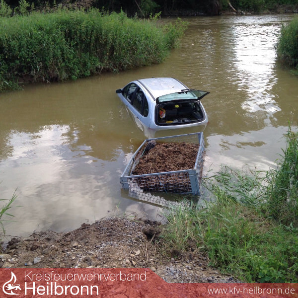 Ein Grundstücksbesitzer belud einen PKW-Anhänger mit Pferdemist. Hierbei machte sich das Fahrzeug selbständig und rollte in ein Seitenbiotop der Jagst. Mit der Seilwinde des Rüstwagens wurde zuerst der Anhänger und dann der PKW aus dem Wasser gezogen.