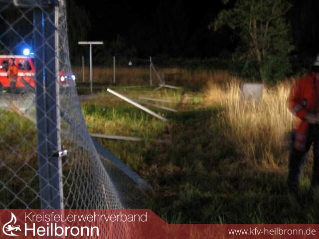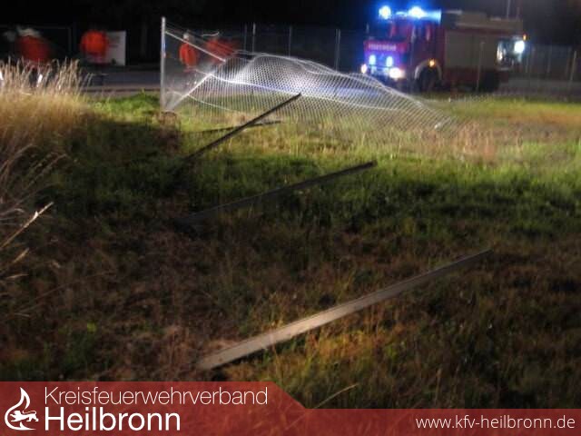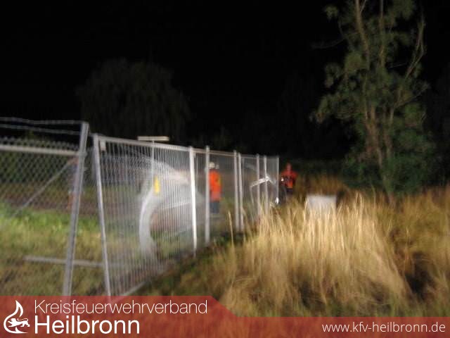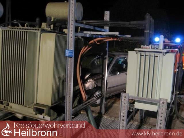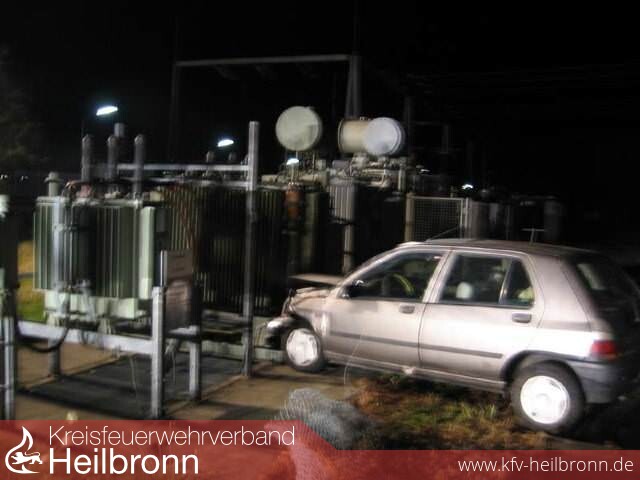An der Salinenstraße war ein Fahrzeug um 90 ° von der Straße abgefahren, hat einen 2 m hohen Zaum der ENBW- Umspannstation auf eine Länge von ca. 15m umgerissen, einen weiteren Bogen von 90 ° geschlagen und ist dann auf einen ölgefüllten Trafo geprallt.