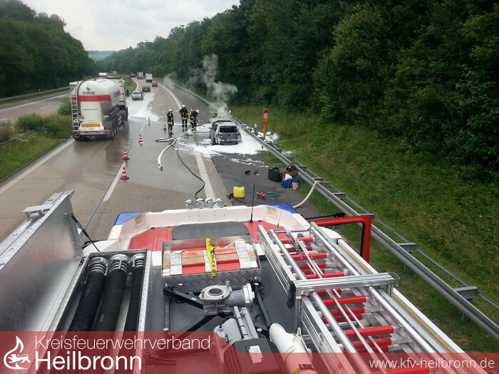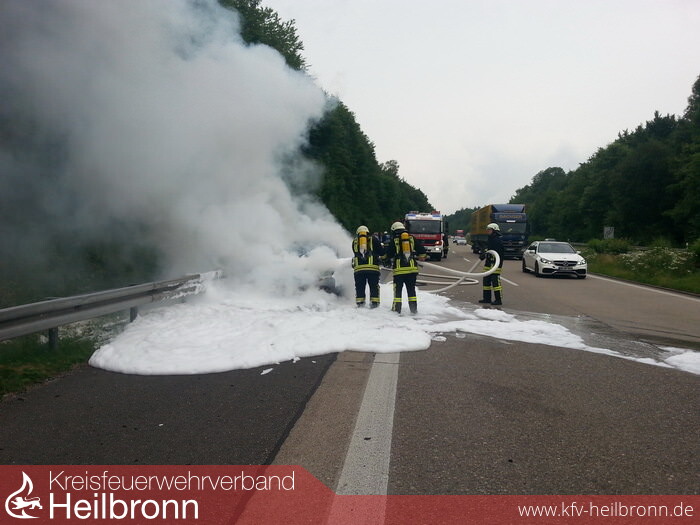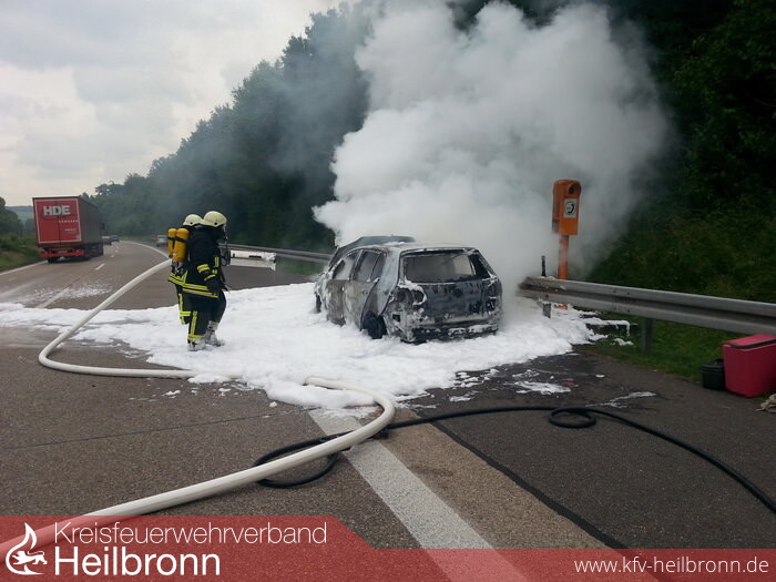 Auf der BAB A81 geriet zwischen der Anschlusstelle Möckmühl und der Raststätte Jagsttal bei km 514,5 in Fahrtrichtung Würzburg ein PKW VW-Golf vermutlich infolge eines technischen Defektes in Brand.